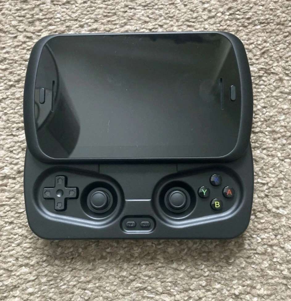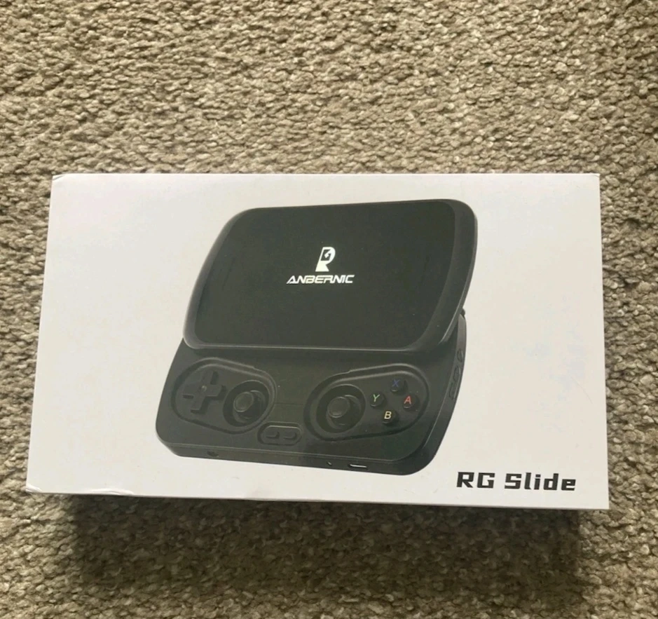 This is an Anbernic RG Slide handheld gaming device. It features a slide-out gamepad with dual joysticks and D-pad controls. The device comes in its original box.