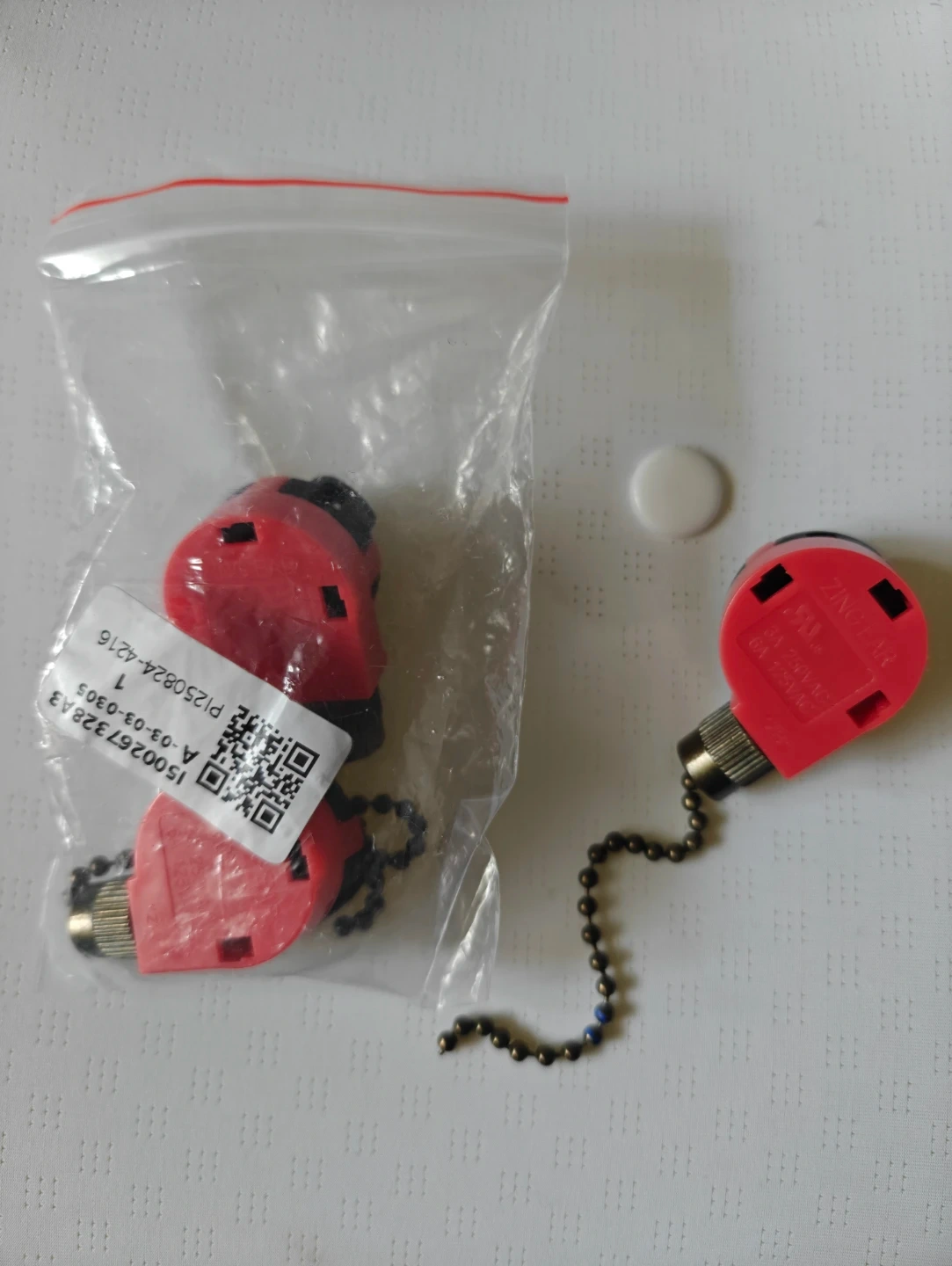 This is a red ceiling fan light pull chain extender. It comes with a metal beaded chain. These are useful for extending existing pull chains.