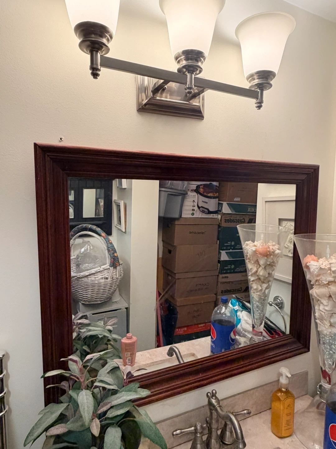 This is a rectangular mirror with a dark wood frame, perfect for a bathroom vanity. Its classic design complements most decor styles. It's a great size for everyday use!