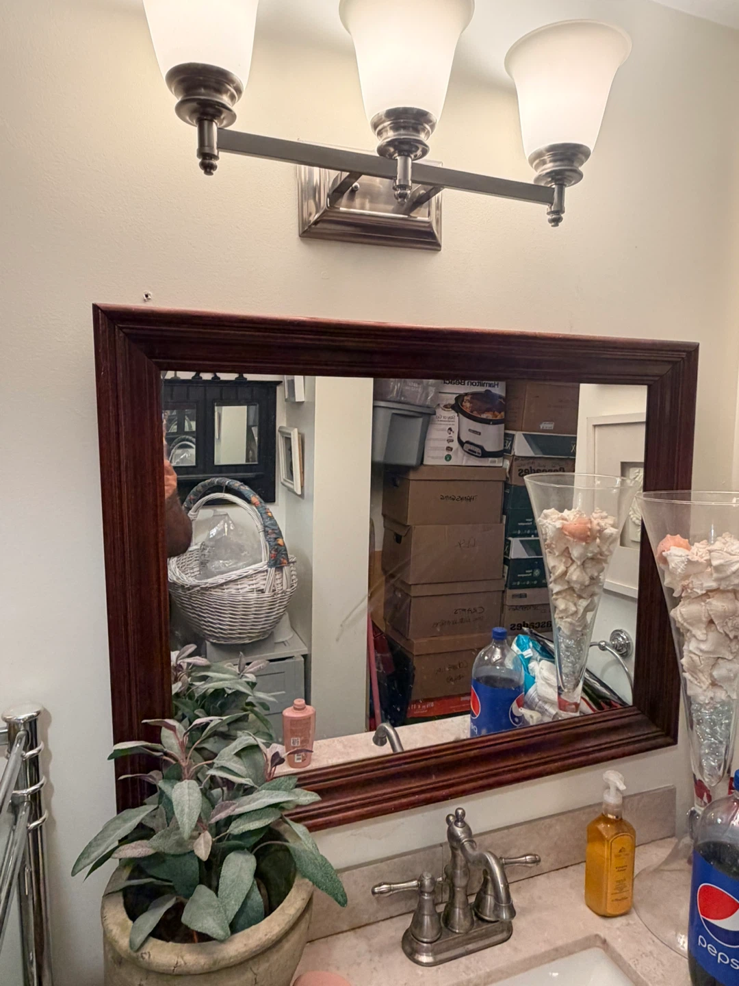 This is a rectangular mirror with a dark wood frame, perfect for a bathroom vanity. Its classic design complements most decor styles. It's a great size for everyday use!