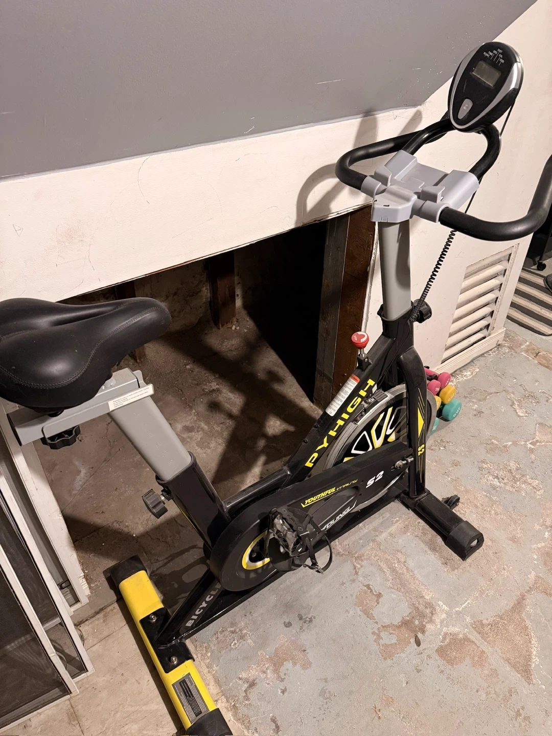 This PYHIGH S2 spin bike is designed for at-home workouts. It has adjustable resistance and a digital display. The bike's frame is black with yellow accents. In perfect working condition. Pick up only.