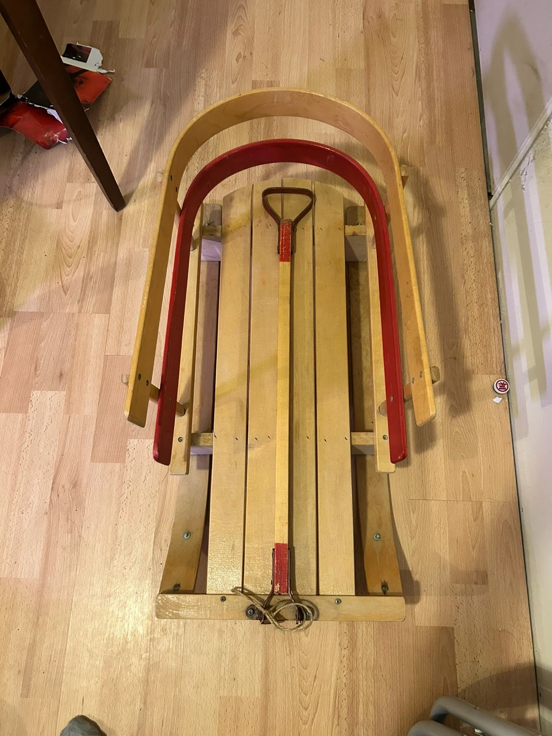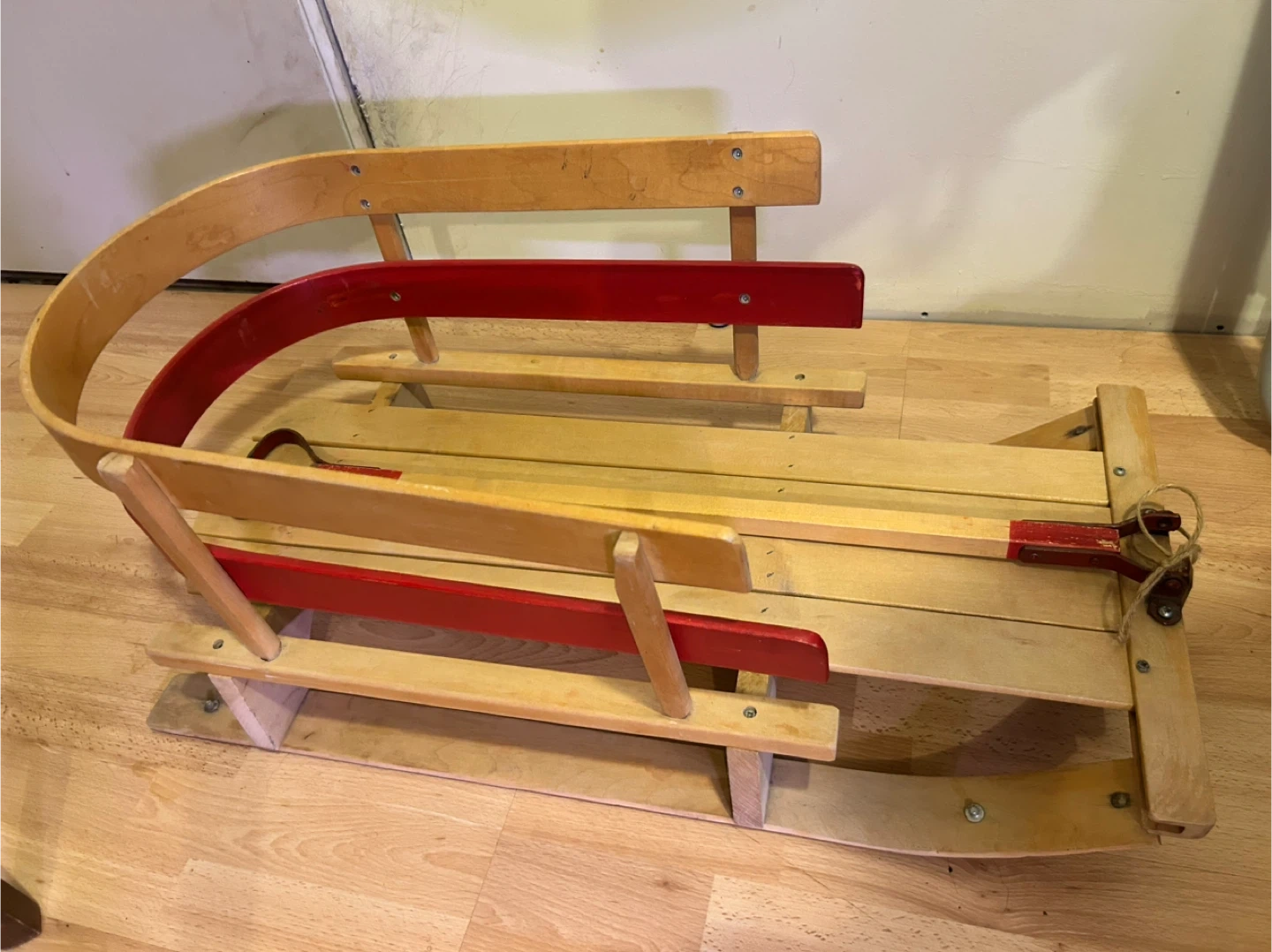Classic wooden sled with red accents and a pull rope. It's made of durable wood and ready for winter fun! This sled is great for kids and adults to enjoy a snowy day. The sturdy construction ensures a fun ride down the hill.