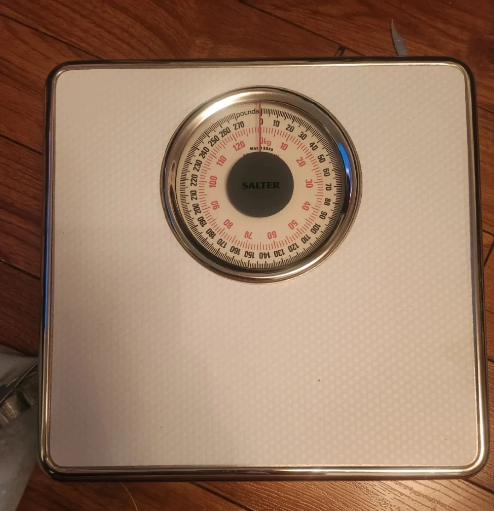 This is a vintage Salter mechanical bathroom scale. It's white with a silver trim. The scale measures in both kilograms and pounds, with a maximum capacity of 130kg.