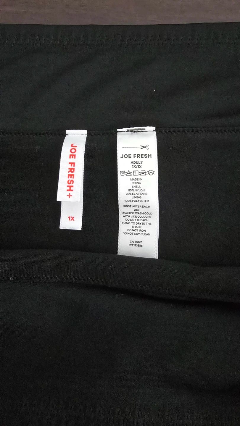 This is a black skirt from Joe Fresh+. It's made of 80% nylon and 20% spandex with a 100% polyester lining. Machine washable with like colours. For swimming, can be used ontop of a one piece bathing suit or on its own.