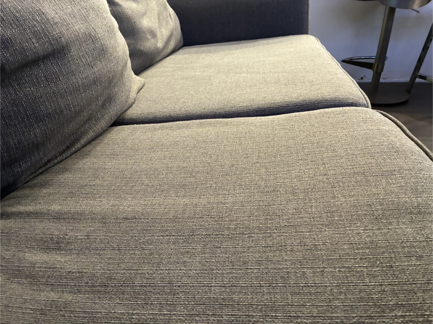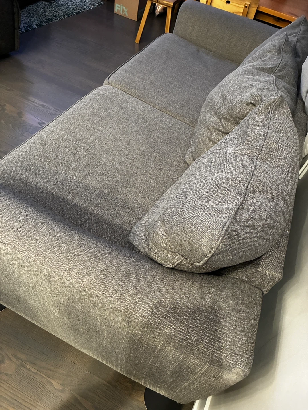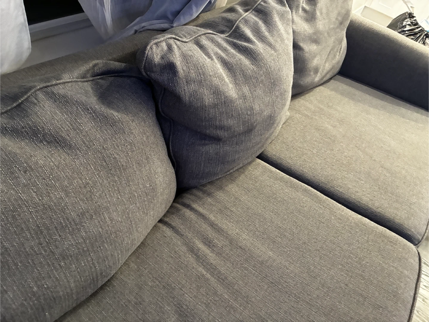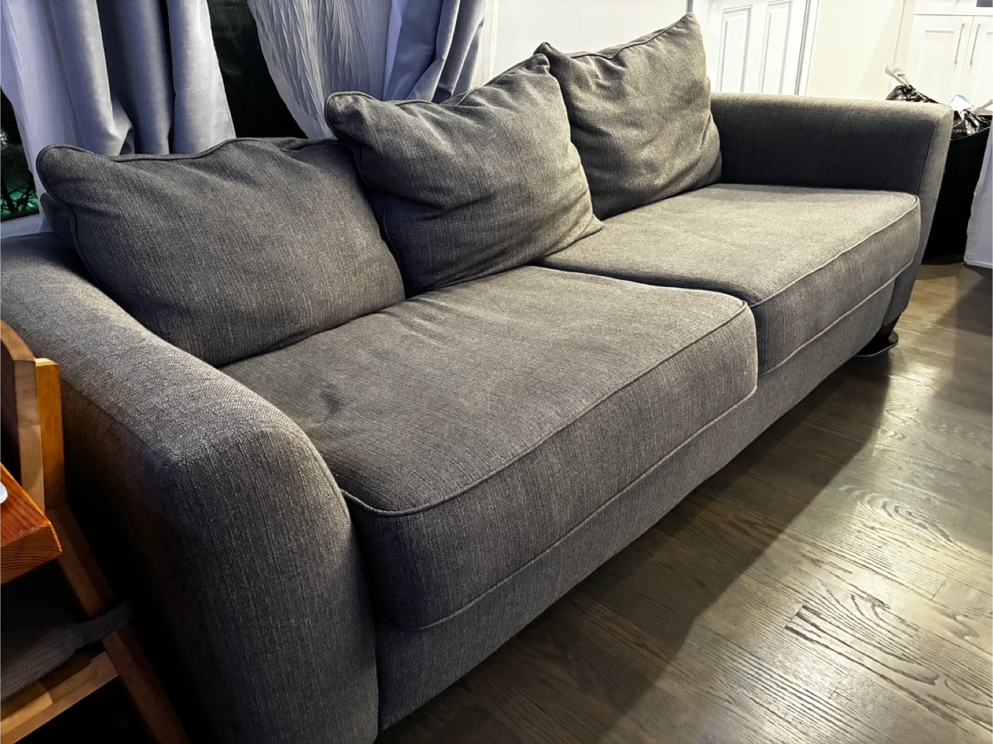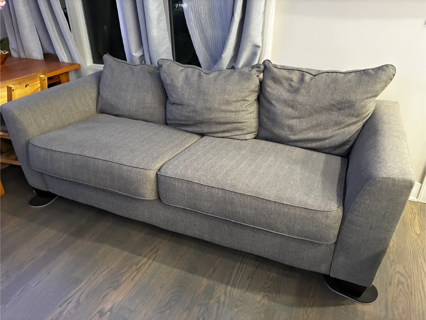 Selling a comfortable gray sofa. It's in good condition and has plush cushions. Selling as is, pickup only. 3rd floor so make sure to get help from someone to bring it down from unit - legs come off for easier carry. No pets so no pet hair on couch.