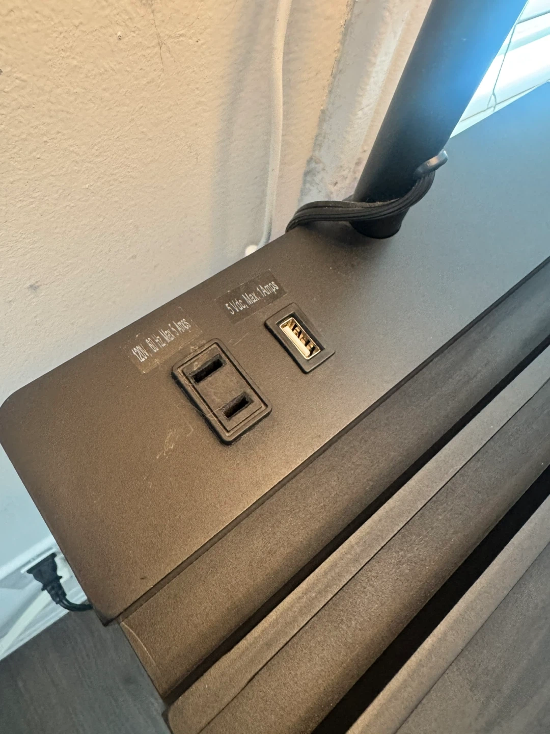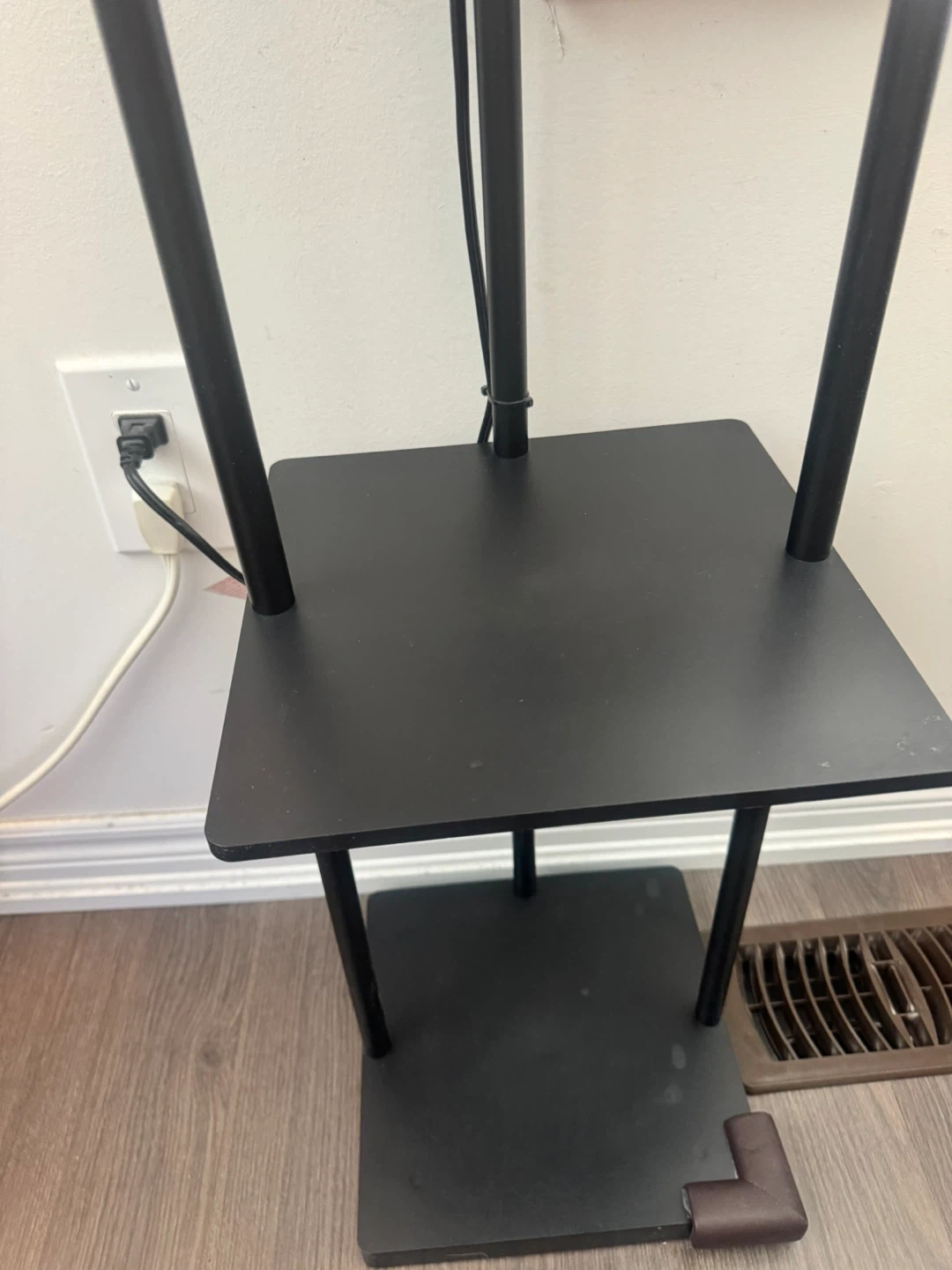 This floor lamp offers convenient lighting and storage. It features two shelves, a built-in power strip with an AC outlet and USB ports The rectangular shade creates a warm ambiance. A great addition to any living room or bedroom!