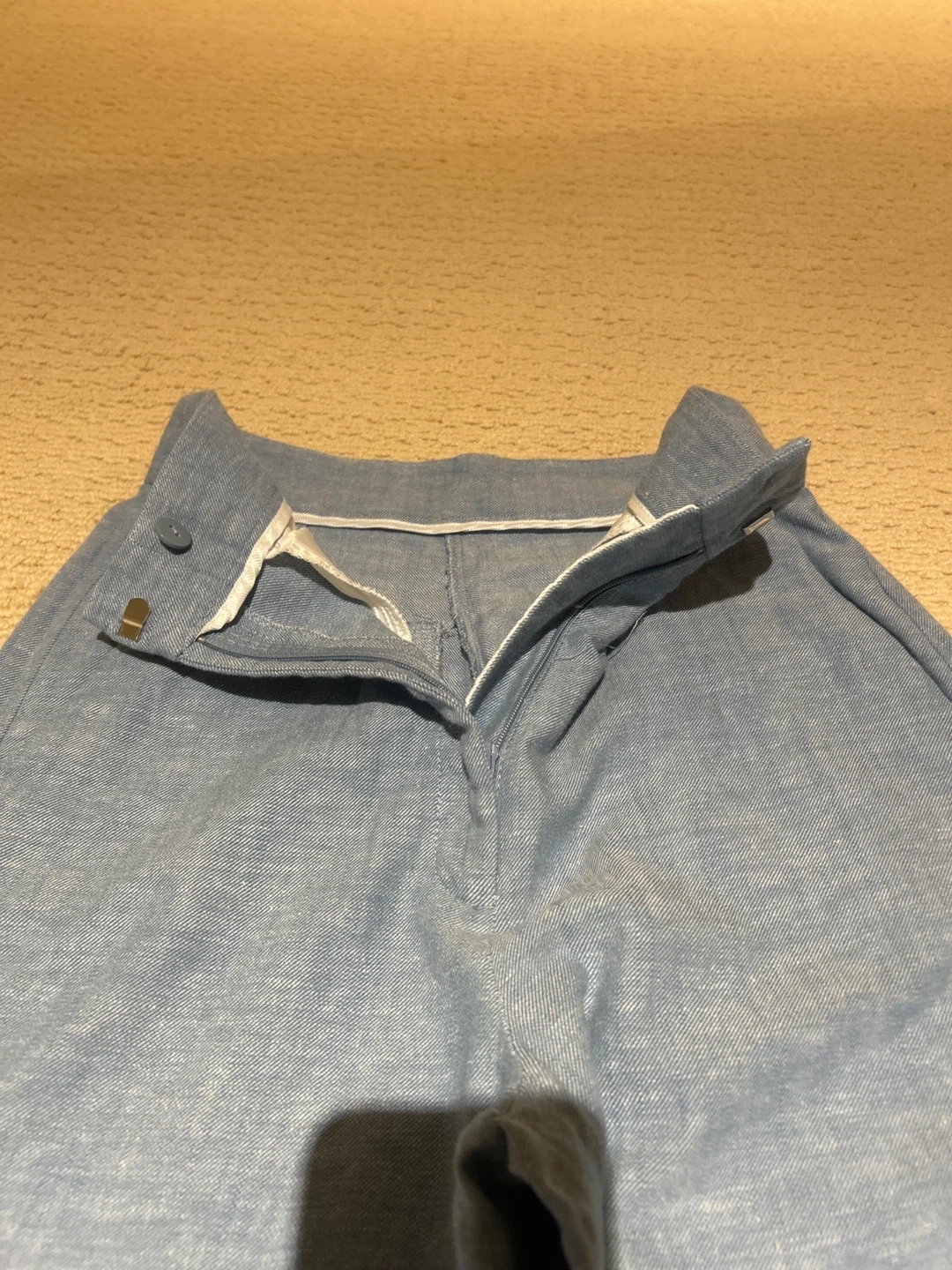 These light blue pants have a slight wide leg silhouette. They feature a button and zipper closure. The fabric appears to be a linen blend.