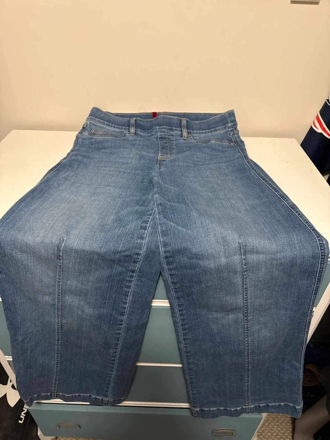 SPANX women's wide leg jeans in a light wash blue. These pants offer a comfortable and stylish silhouette. Made from a denim fabric with a slight stretch for ease of wear.