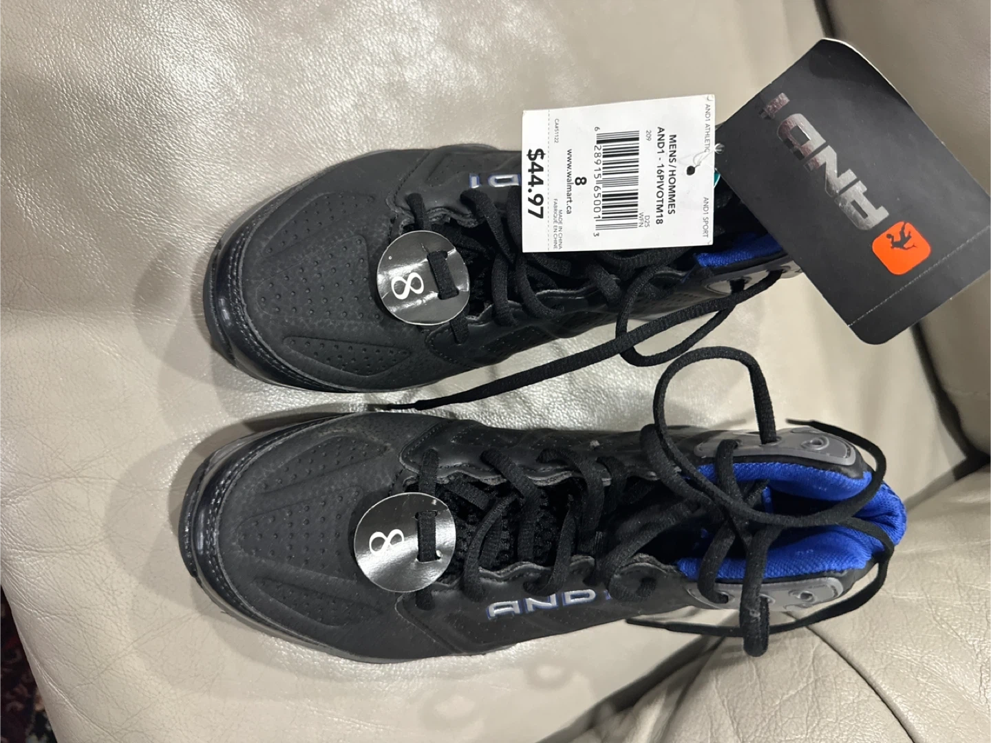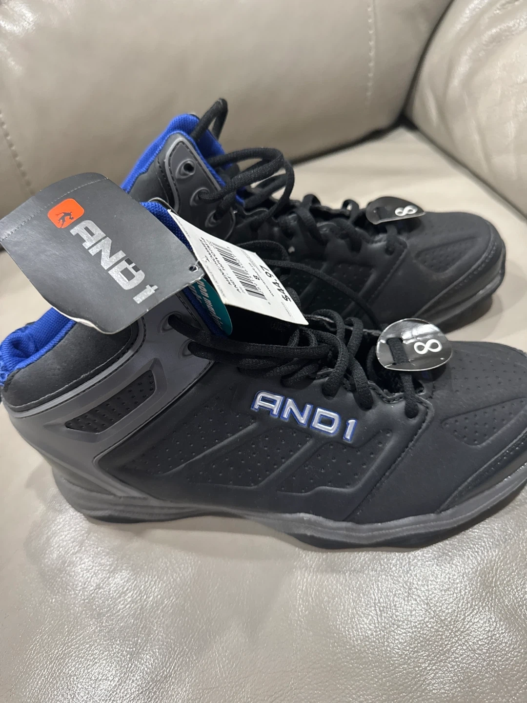 Brand new shoes in black with blue accents. These men's shoes are a size 8. They're designed for comfort and performance on the court.