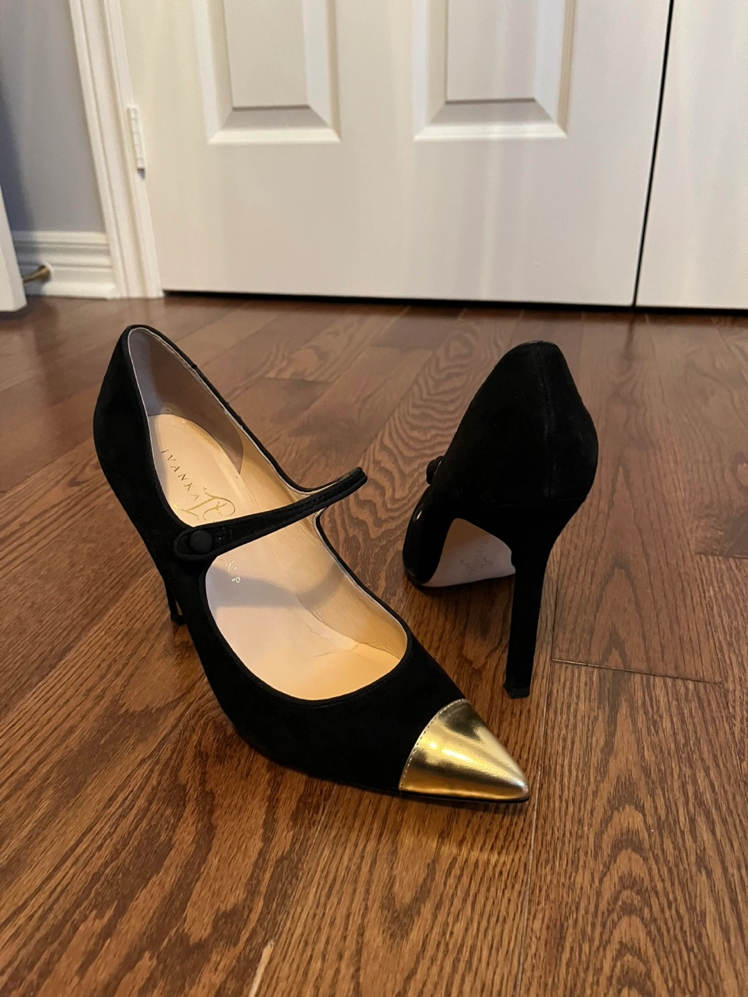 These are a pair of Ivanka Trump black heels. They feature a gold toe cap and a strap with a button closure. They are a size 9 and would be a great addition to your wardrobe!