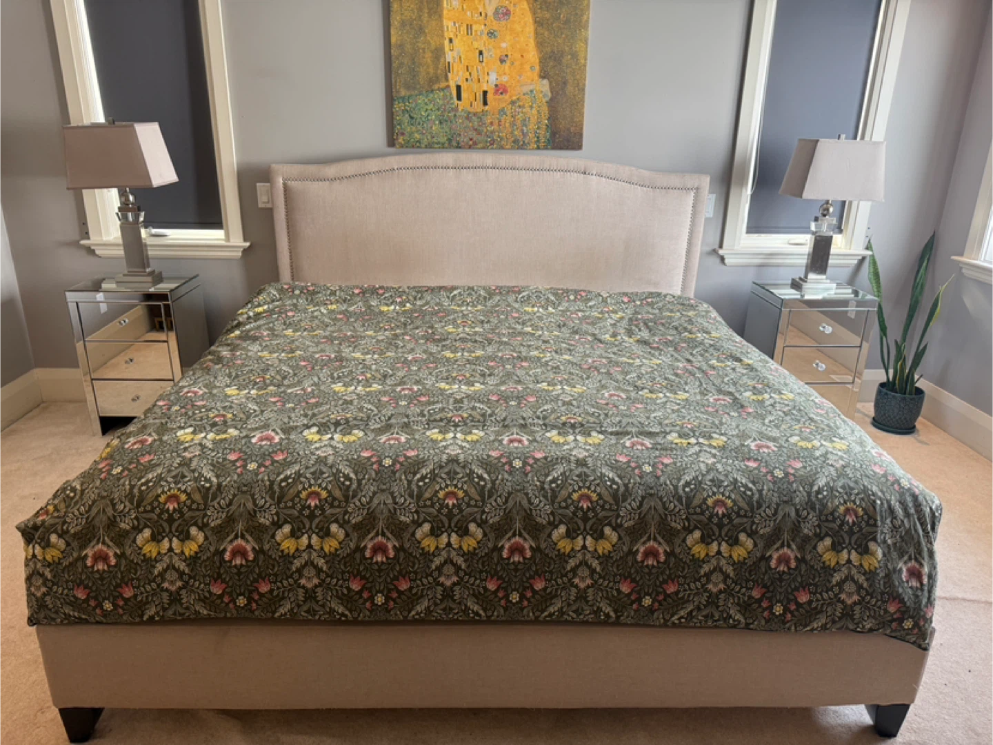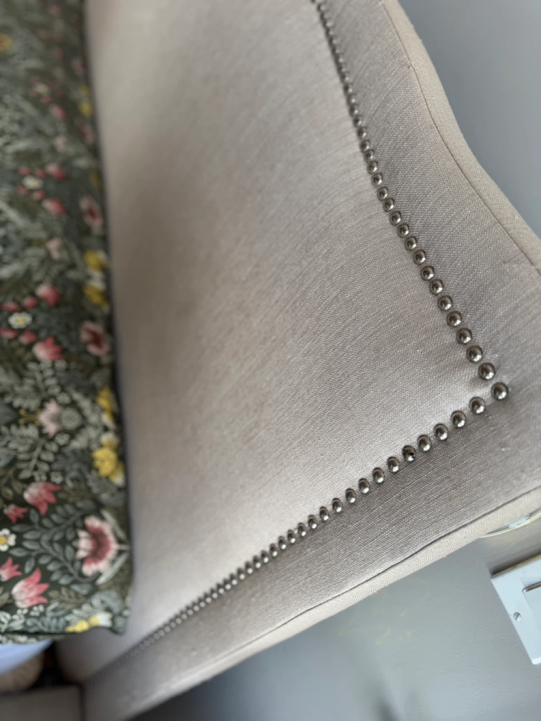 Selling a lovely upholstered bed frame! It's in great shape and would look fantastic in any bedroom. The neutral colour makes it easy to match with any decor. It features a stylish headboard with decorative nailhead trim. A great addition to create a cozy and inviting space!