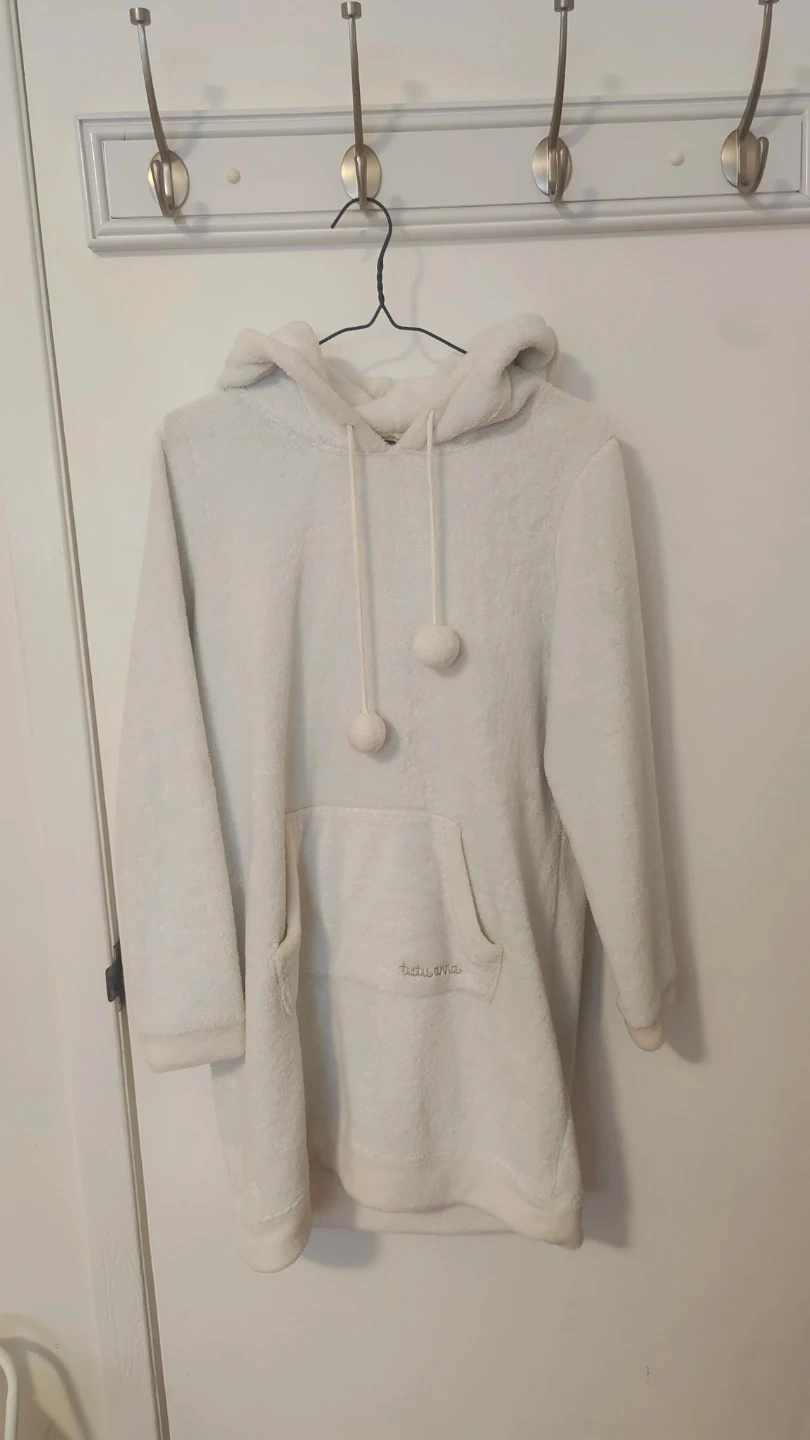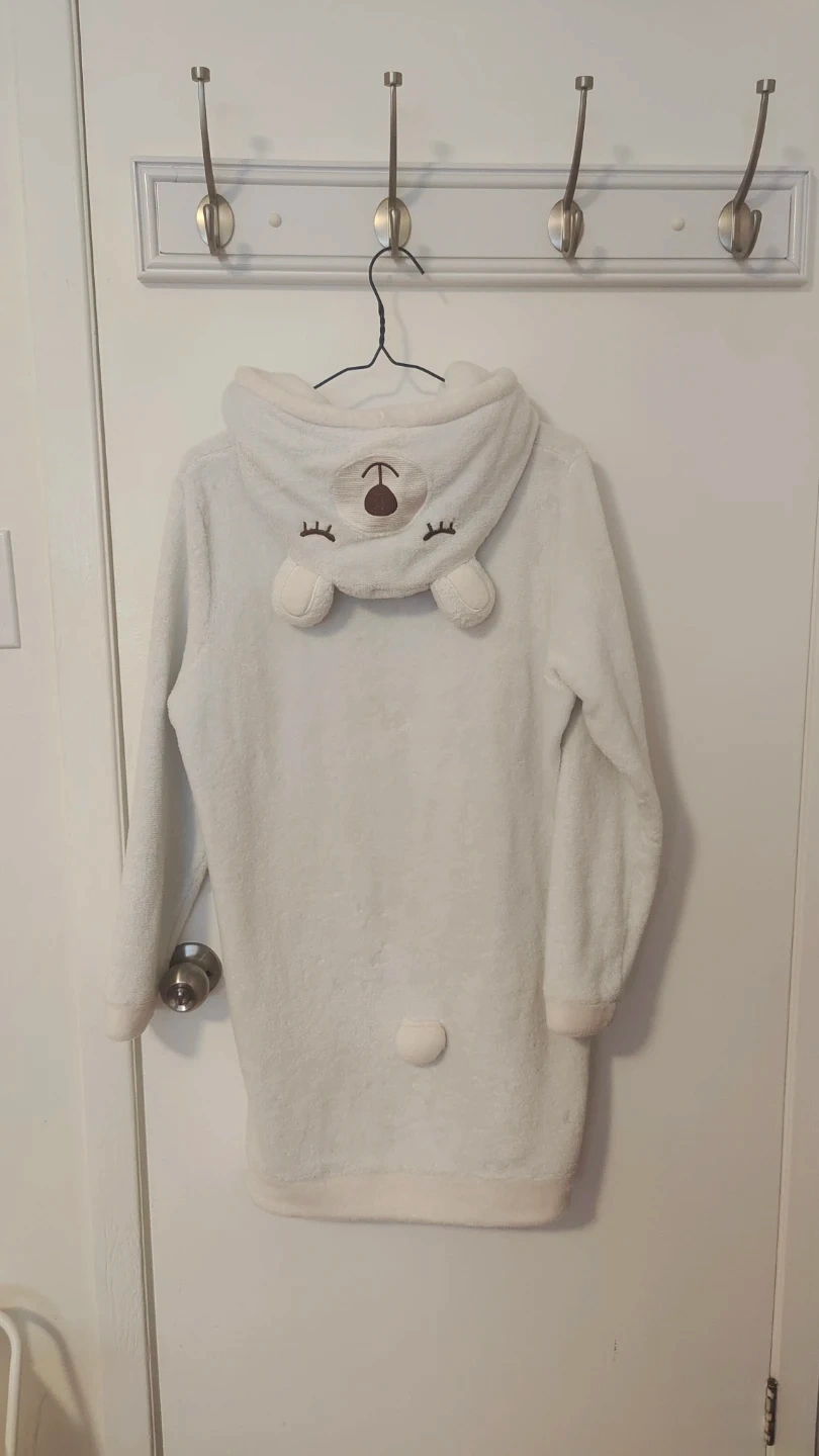 This super soft, fuzzy white hoodie is designed to keep you warm and comfy. It features a cute bear face on the hood and a kangaroo pocket at the front. Perfect for lounging around the house!