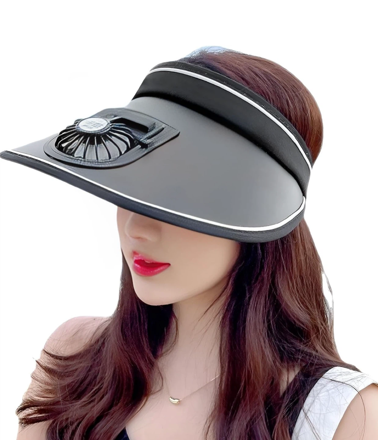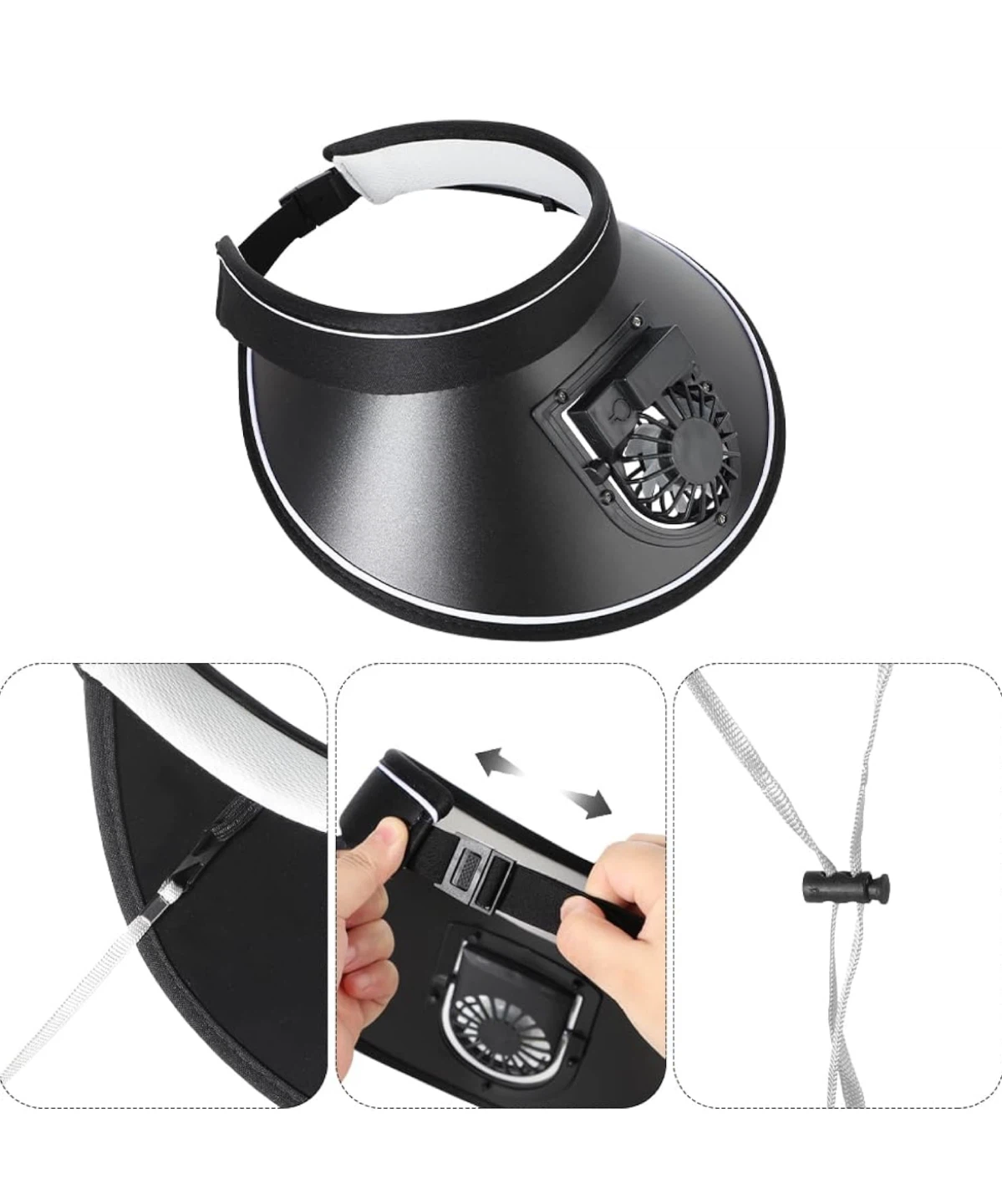 Stay cool with this black sun visor featuring a built-in fan! It's adjustable for a comfy fit and has a chin strap for security. Great for sunny days outdoors!