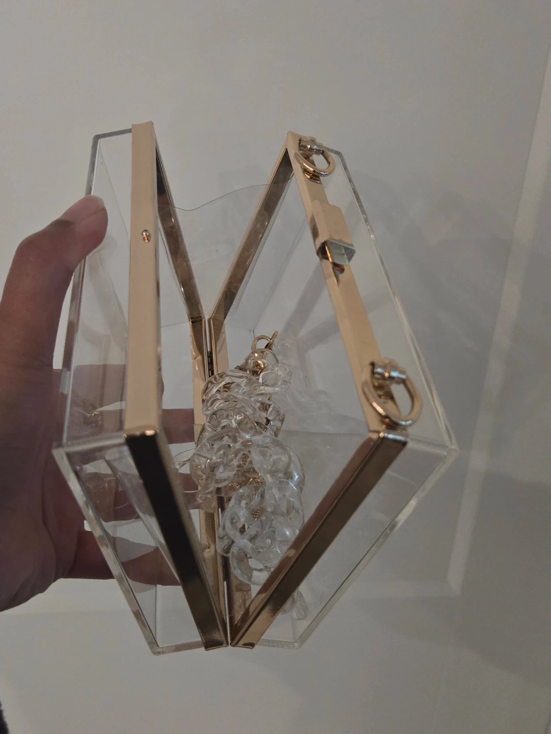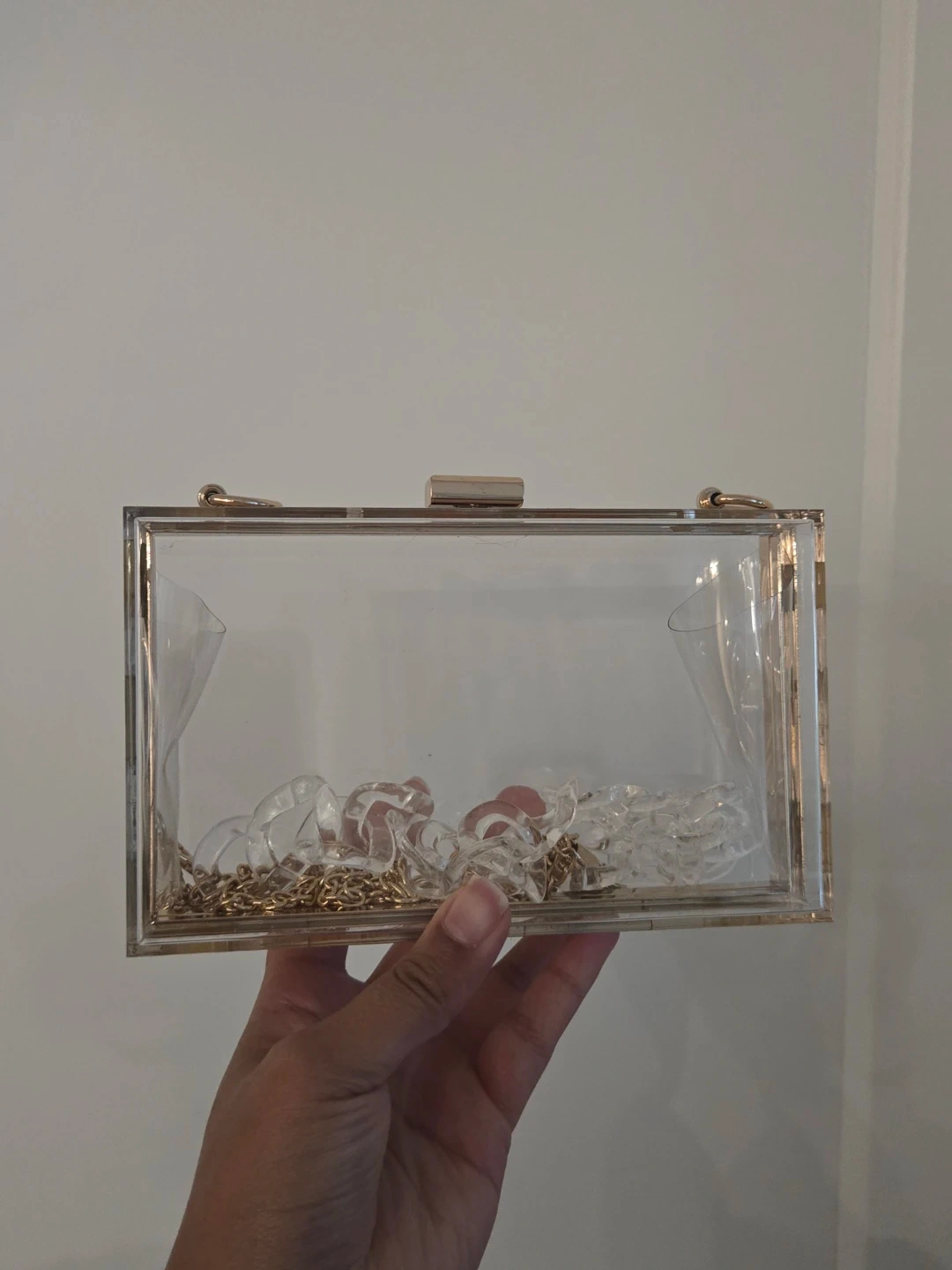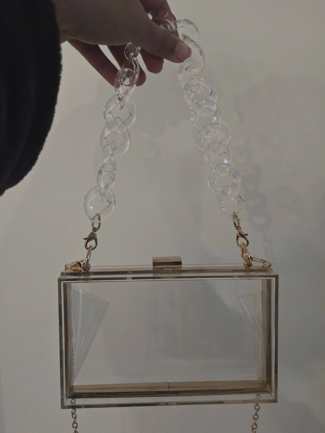 Clear purse with clasp and 2 different chains (gold and clear). Perfect for stadium events (sports, concerts, parties etc)