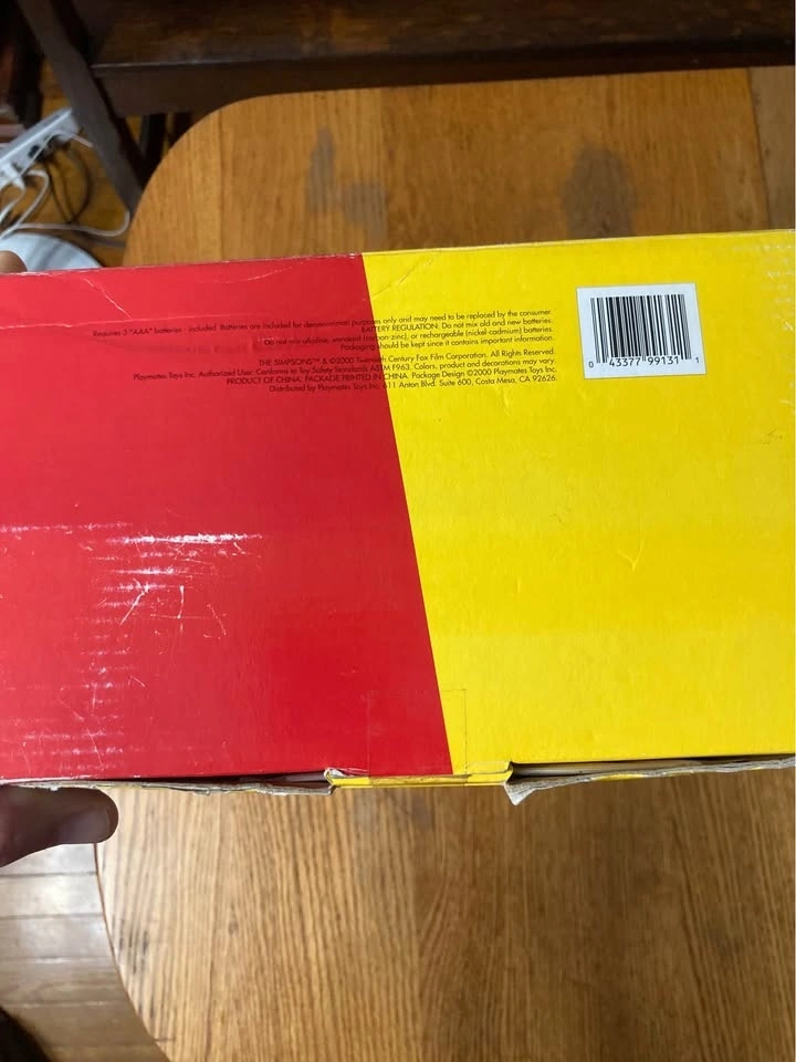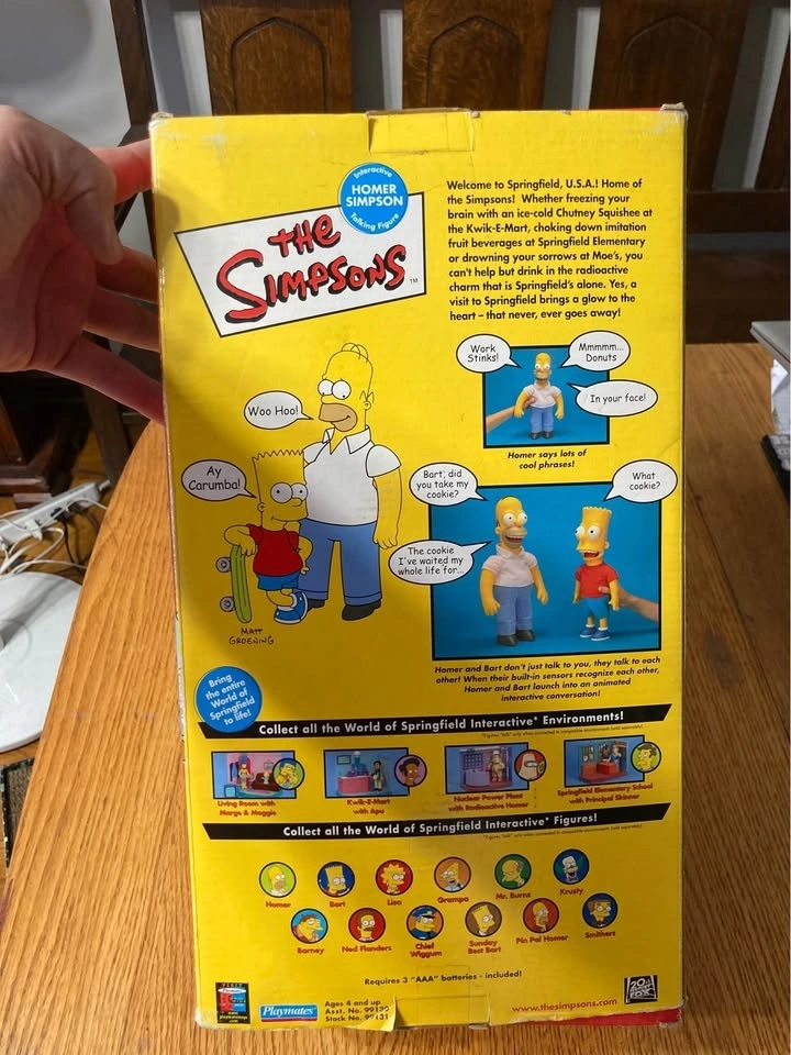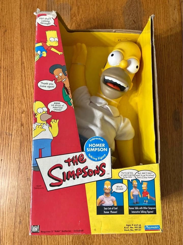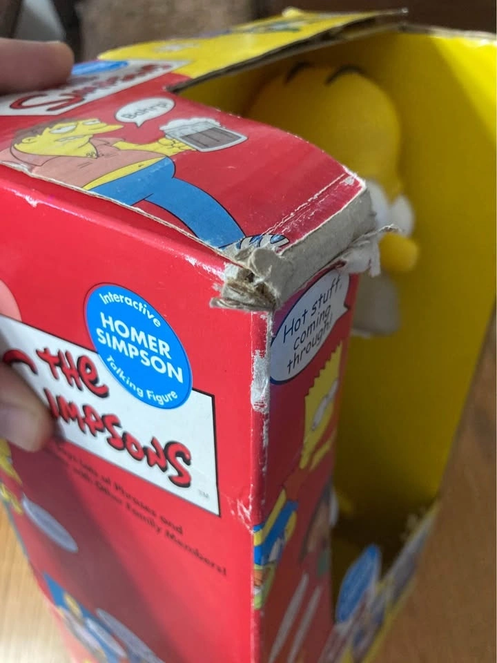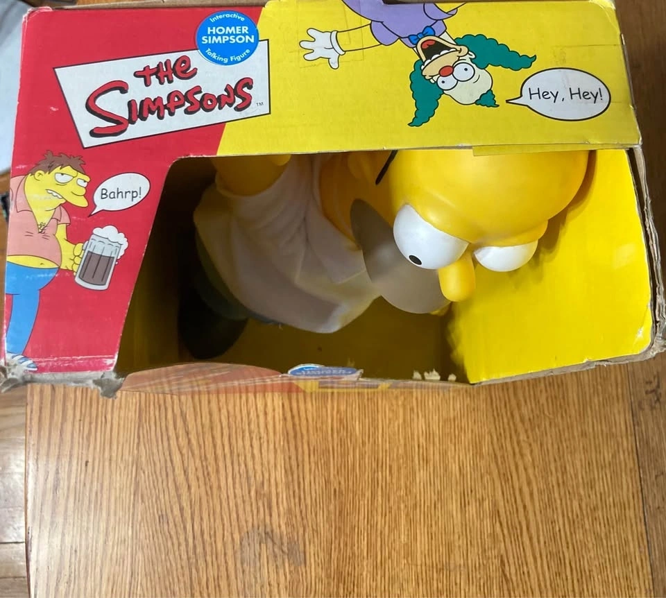 Vintage 16in Homer Simpson playmates plush. Bought some years ago at a flea market, Original box, but appears to have been opened and resealed. Box has some damage and signs of wear. I have never opened it and am not sure if Homer talks, although perfect gift for the Simpsons fan in your life. Takes AAA batteries