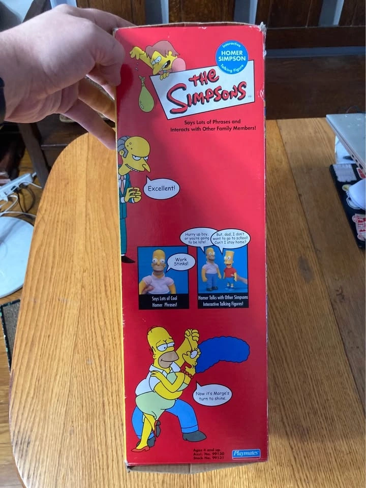 Vintage 16in Homer Simpson playmates plush. Bought some years ago at a flea market, Original box, but appears to have been opened and resealed. Box has some damage and signs of wear. I have never opened it and am not sure if Homer talks, although perfect gift for the Simpsons fan in your life. Takes AAA batteries