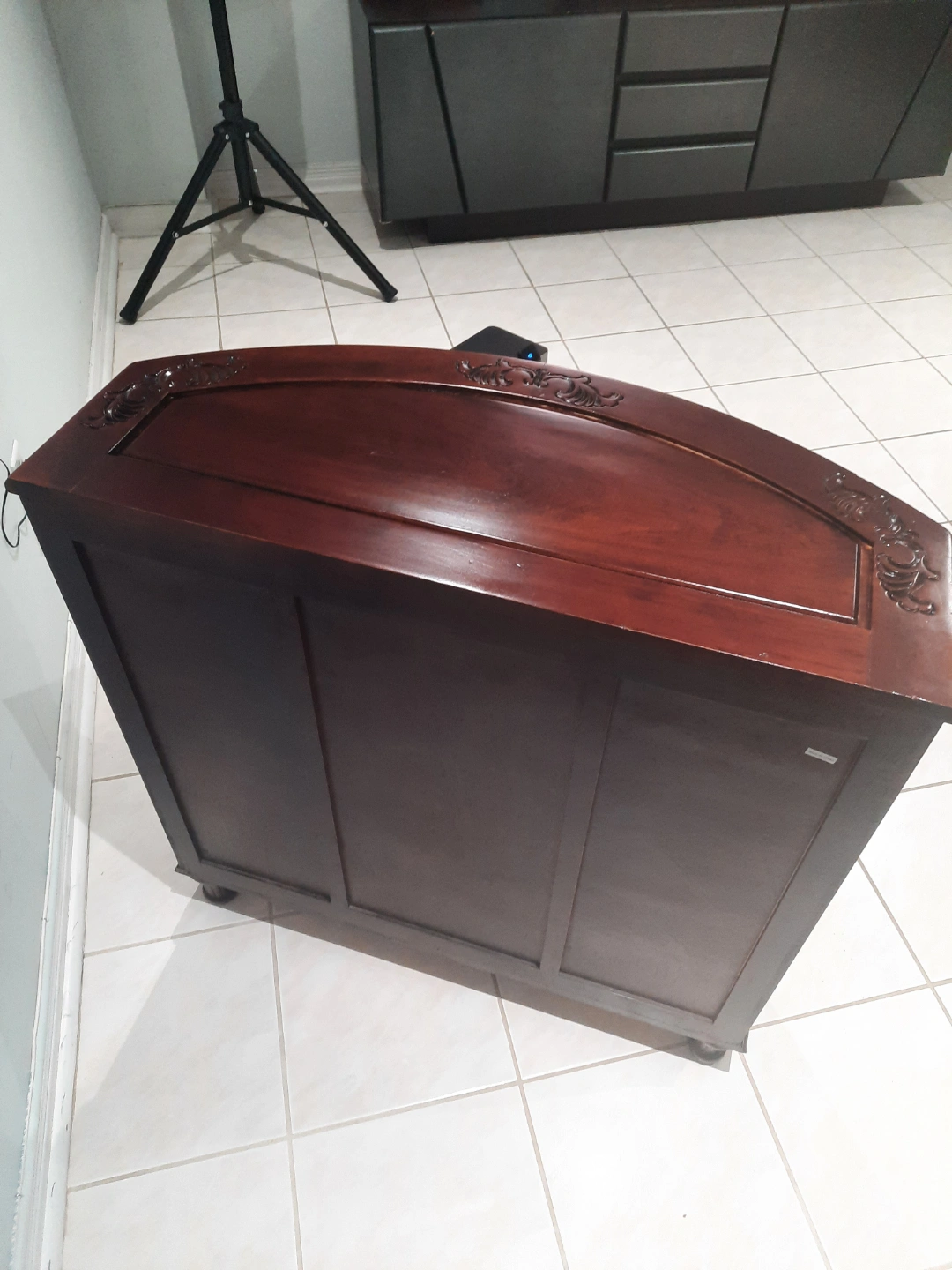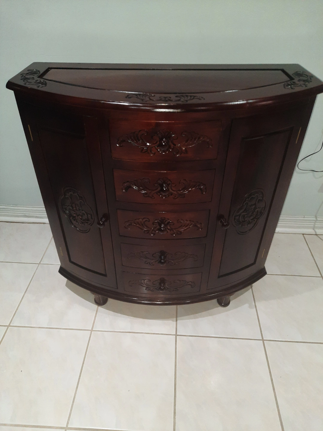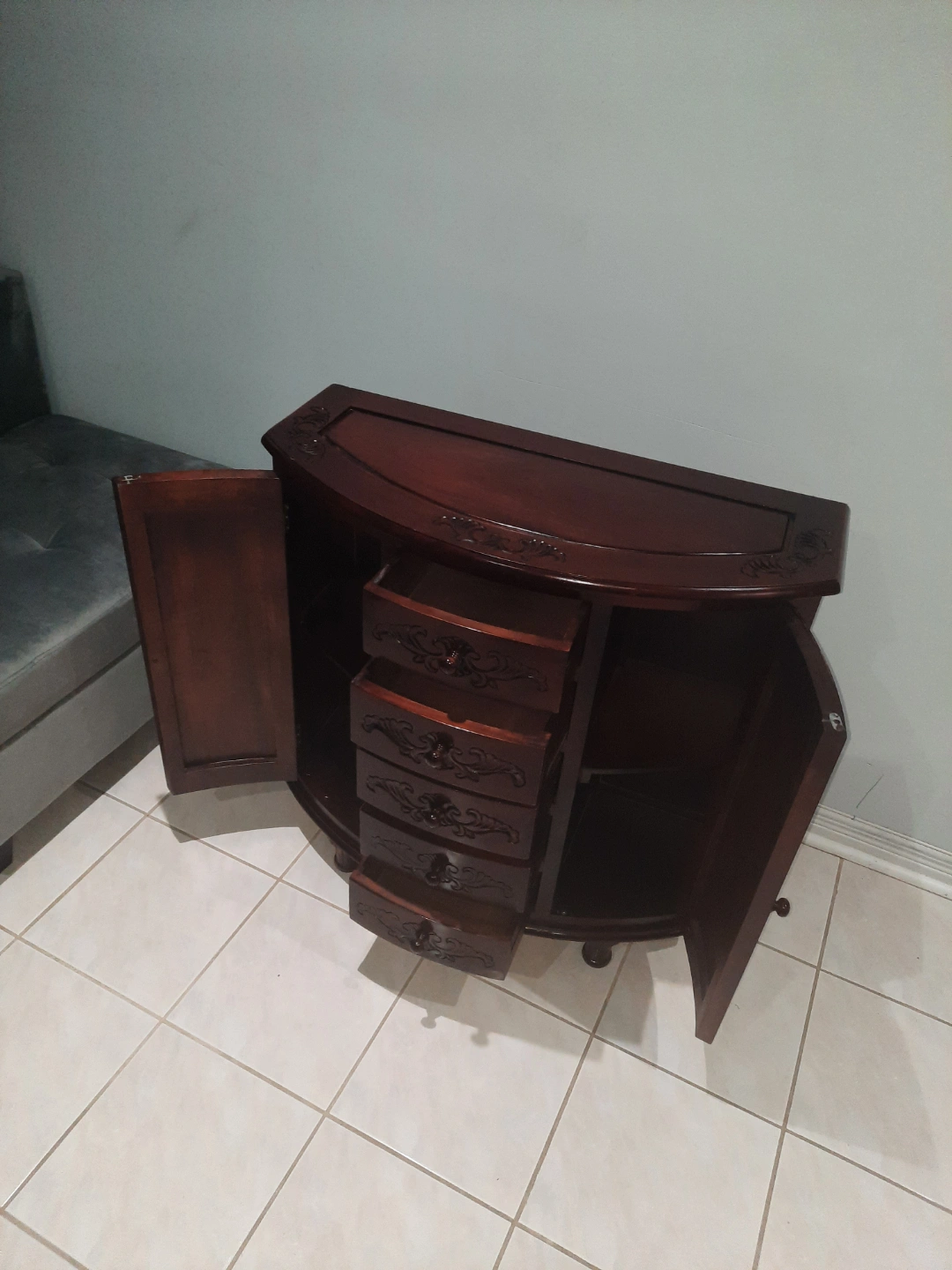 Dark brown wooden console table. Features a curved front, five drawers, and two doors. Intricate carvings adorn the drawers and doors. Solid wood construction. Small size, perfect for a hallway or entryway.