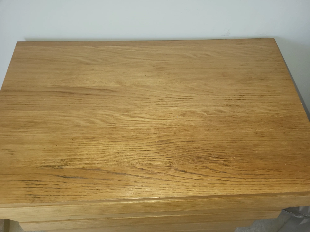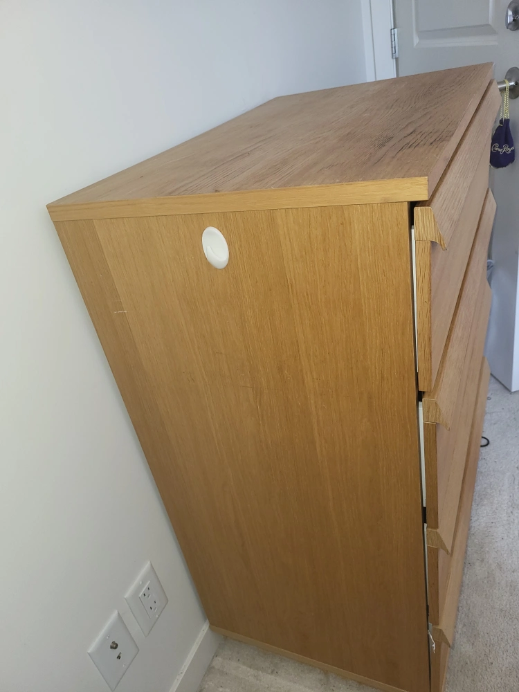 Selling an Ikea wooden dresser with four drawers. It's in good condition and would be great for extra storage in a bedroom or closet. The wood has a nice, natural grain pattern.