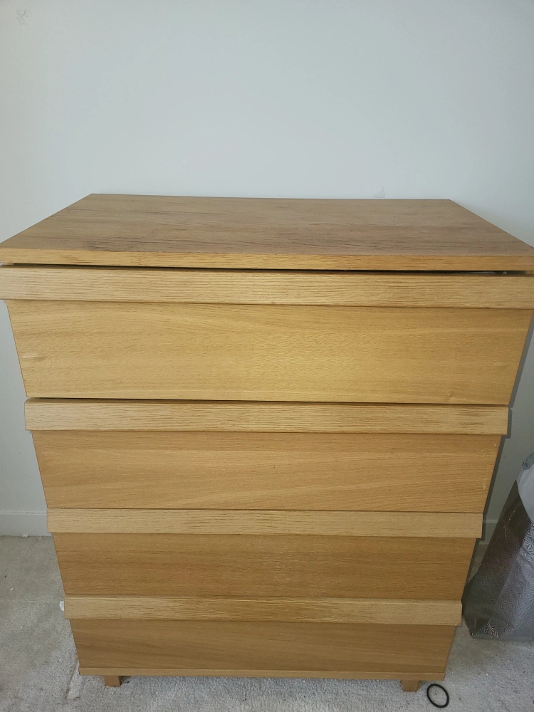 Selling an Ikea wooden dresser with four drawers. It's in good condition and would be great for extra storage in a bedroom or closet. The wood has a nice, natural grain pattern.