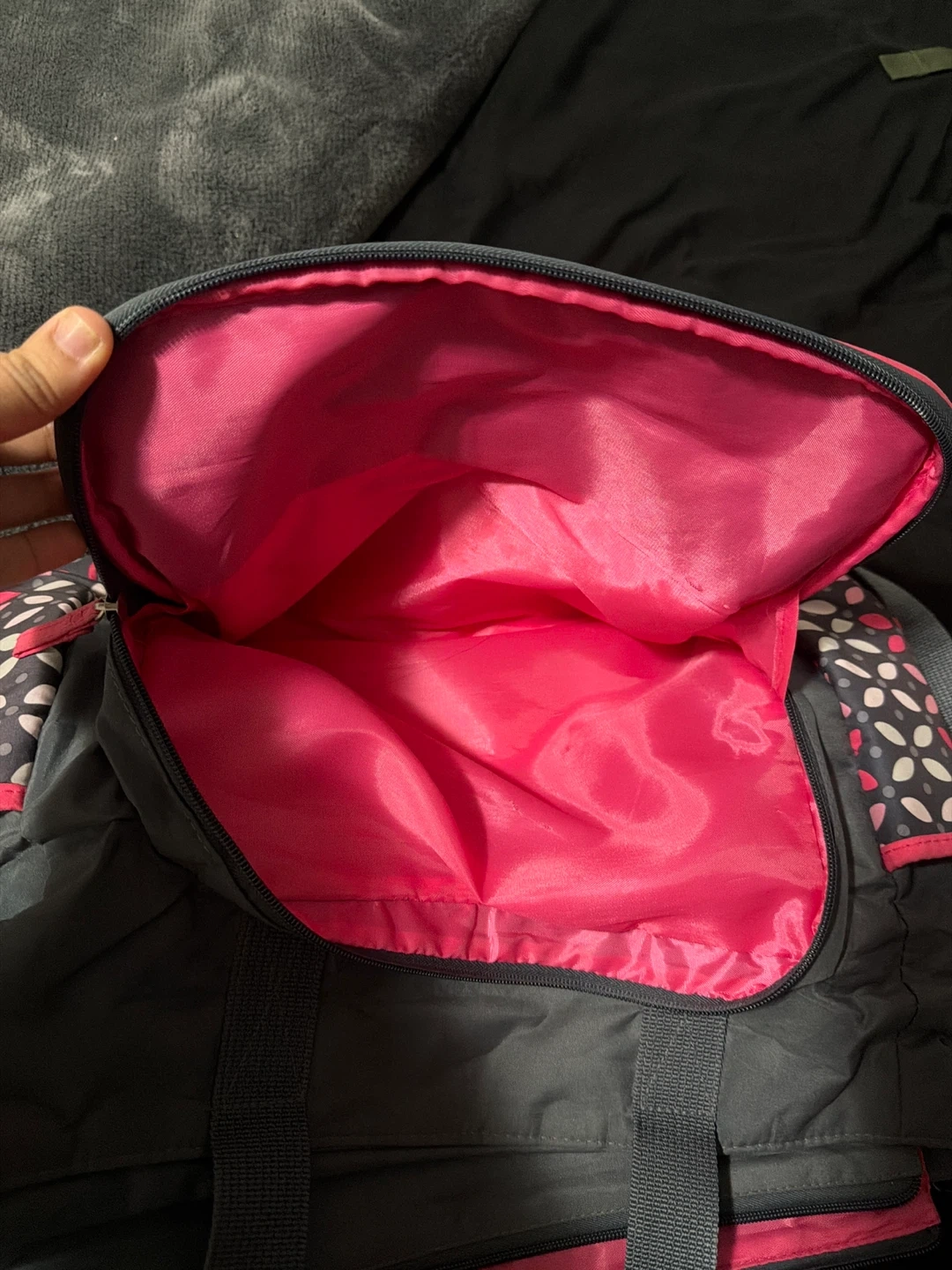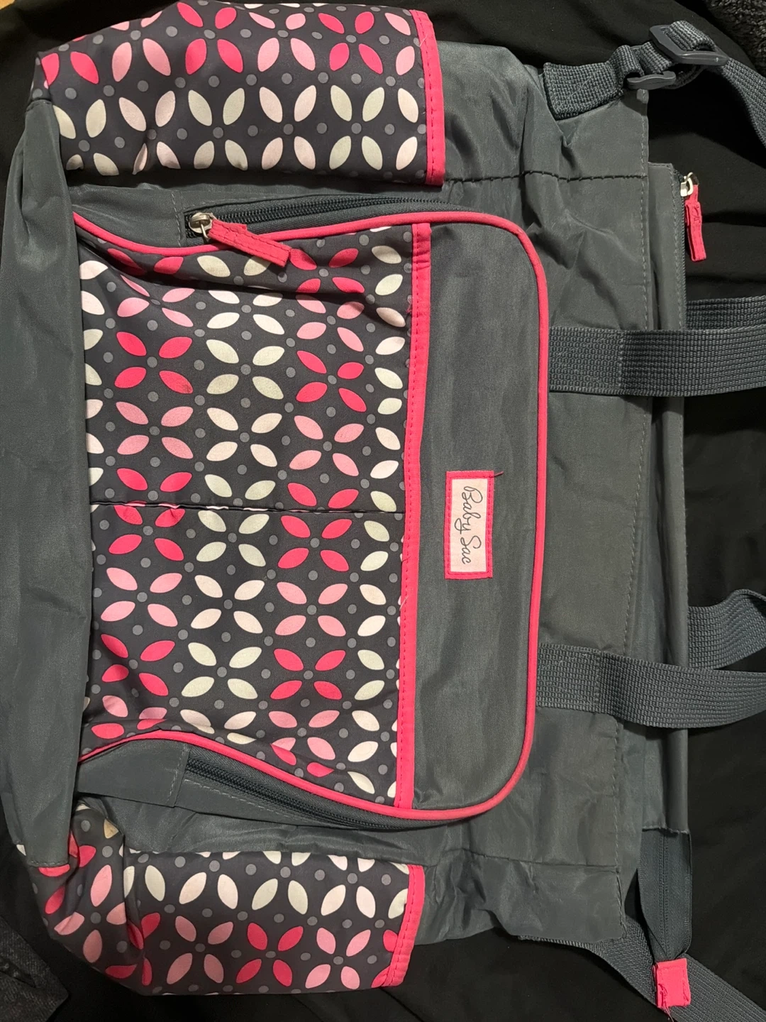 Grey and pink patterned diaper bag by Baby Soo. It has a spacious main compartment with interior pockets. Includes two sturdy top handles and a removable shoulder strap.