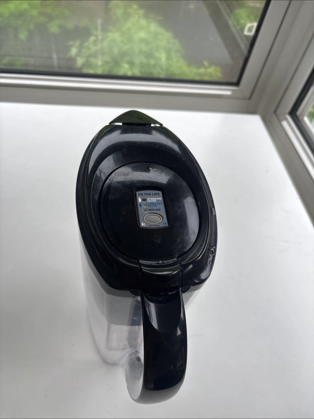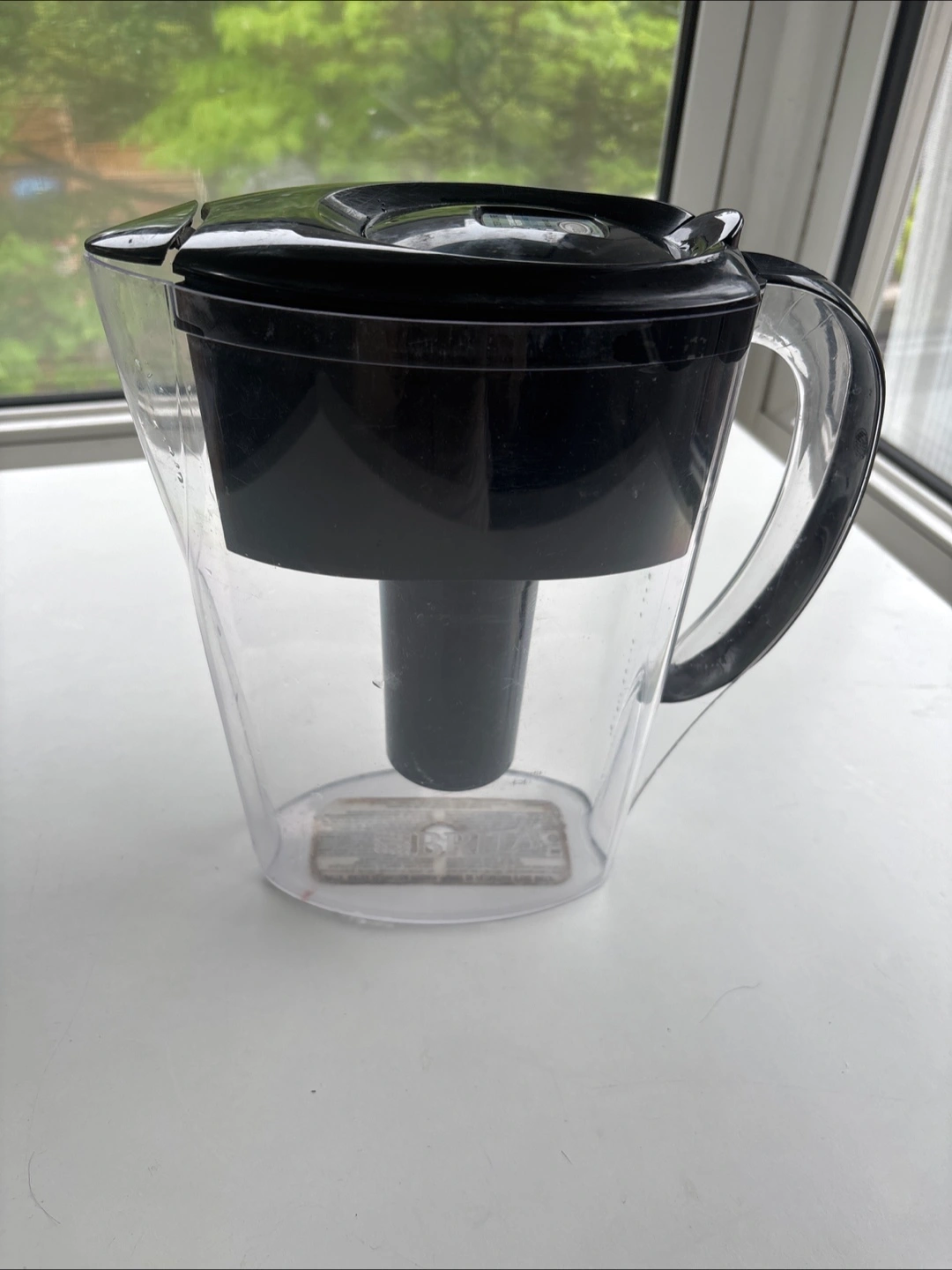 A transparent water pitcher. Features a black lid with a filter. The pitcher has a handle for easy pouring. You could easily keep this beside your bed for a refreshing glass of water before you go to sleep.