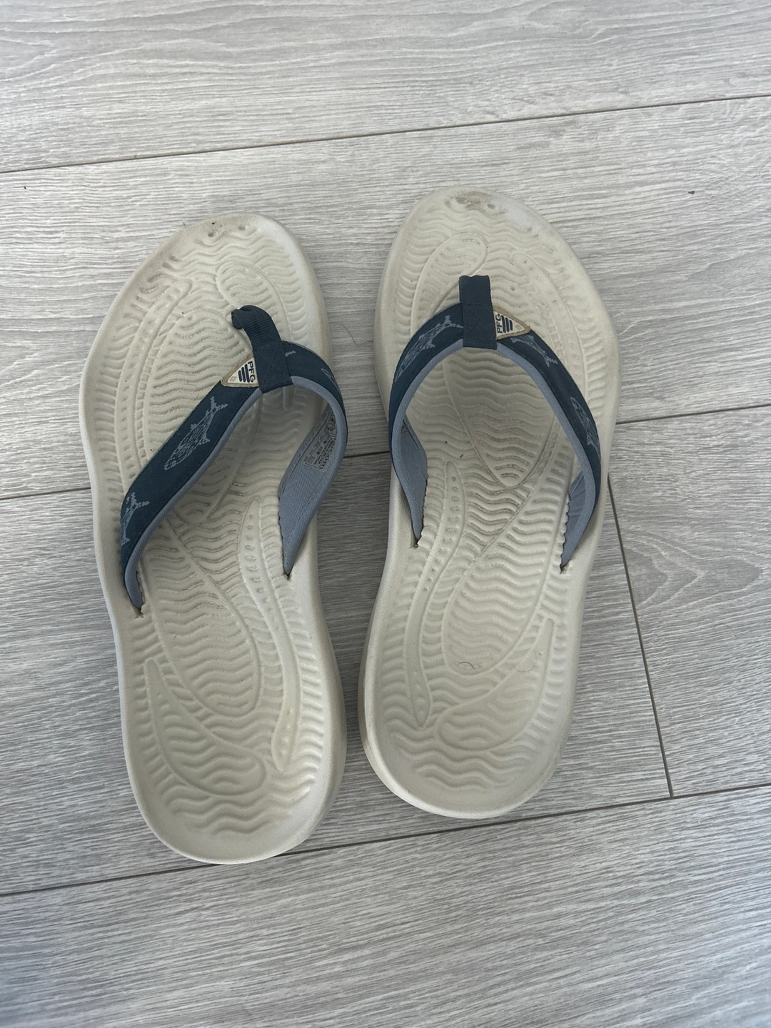 These are a pair of men's Columbia flip flops. They are in the colour blue and white. Lightly warn They are a size 12