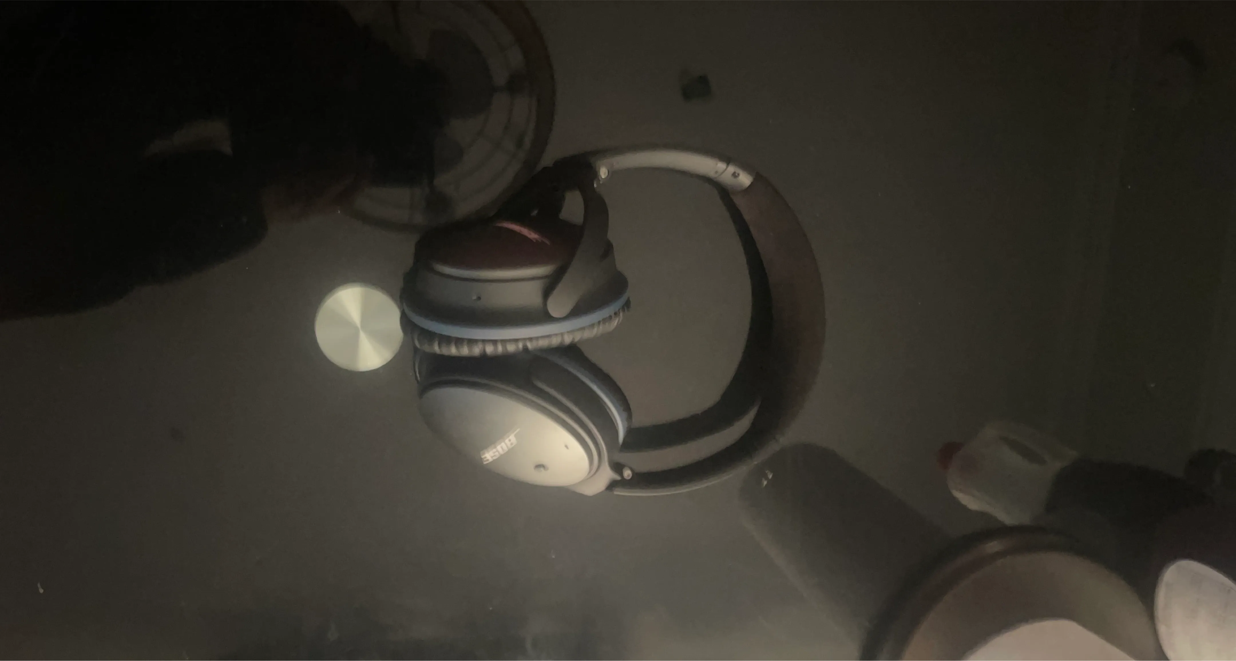 Bose QuietComfort 35 II headphones with active noise cancellation. They're comfortable for long listening sessions. Includes the headphones and charging cable.