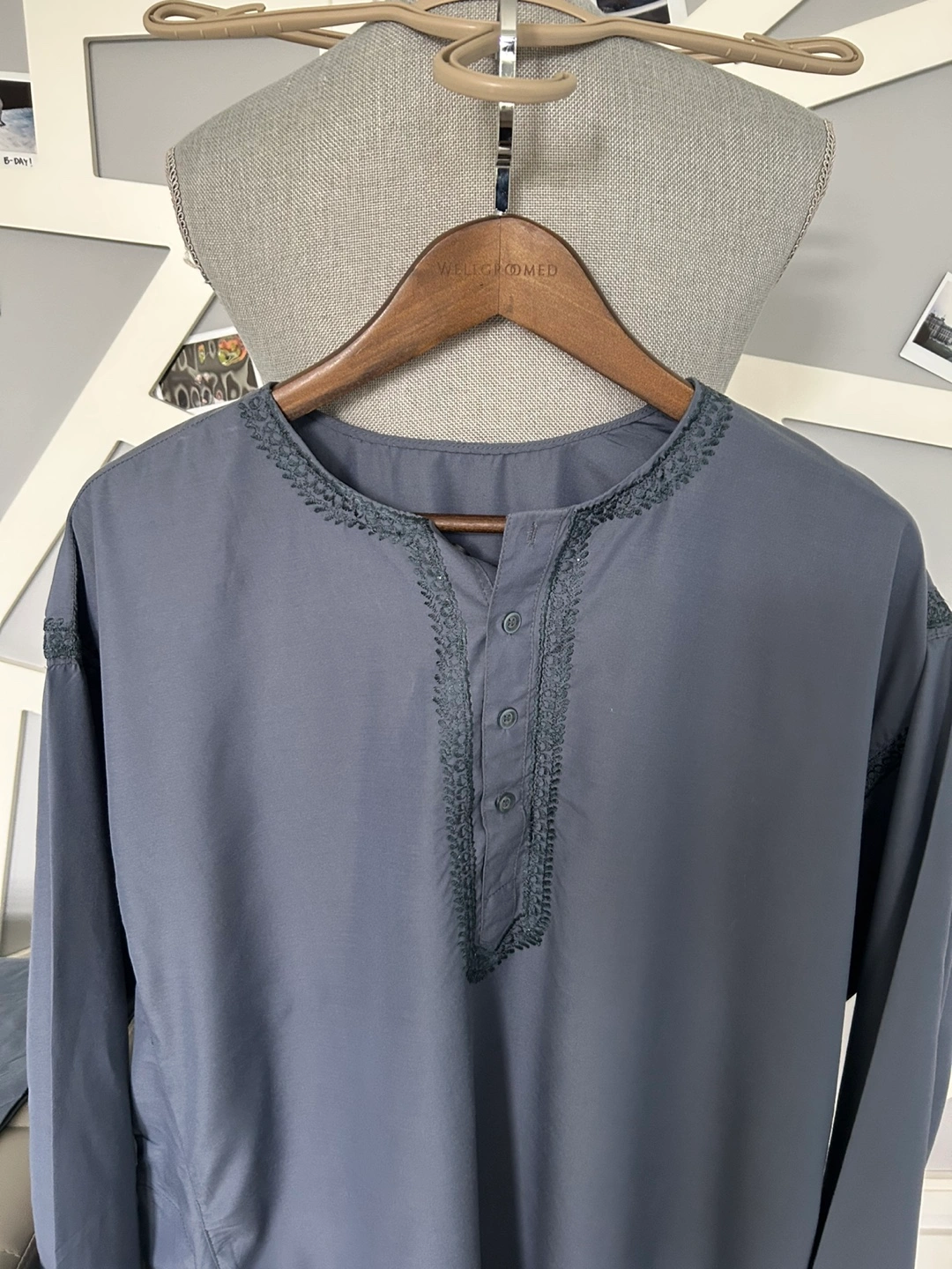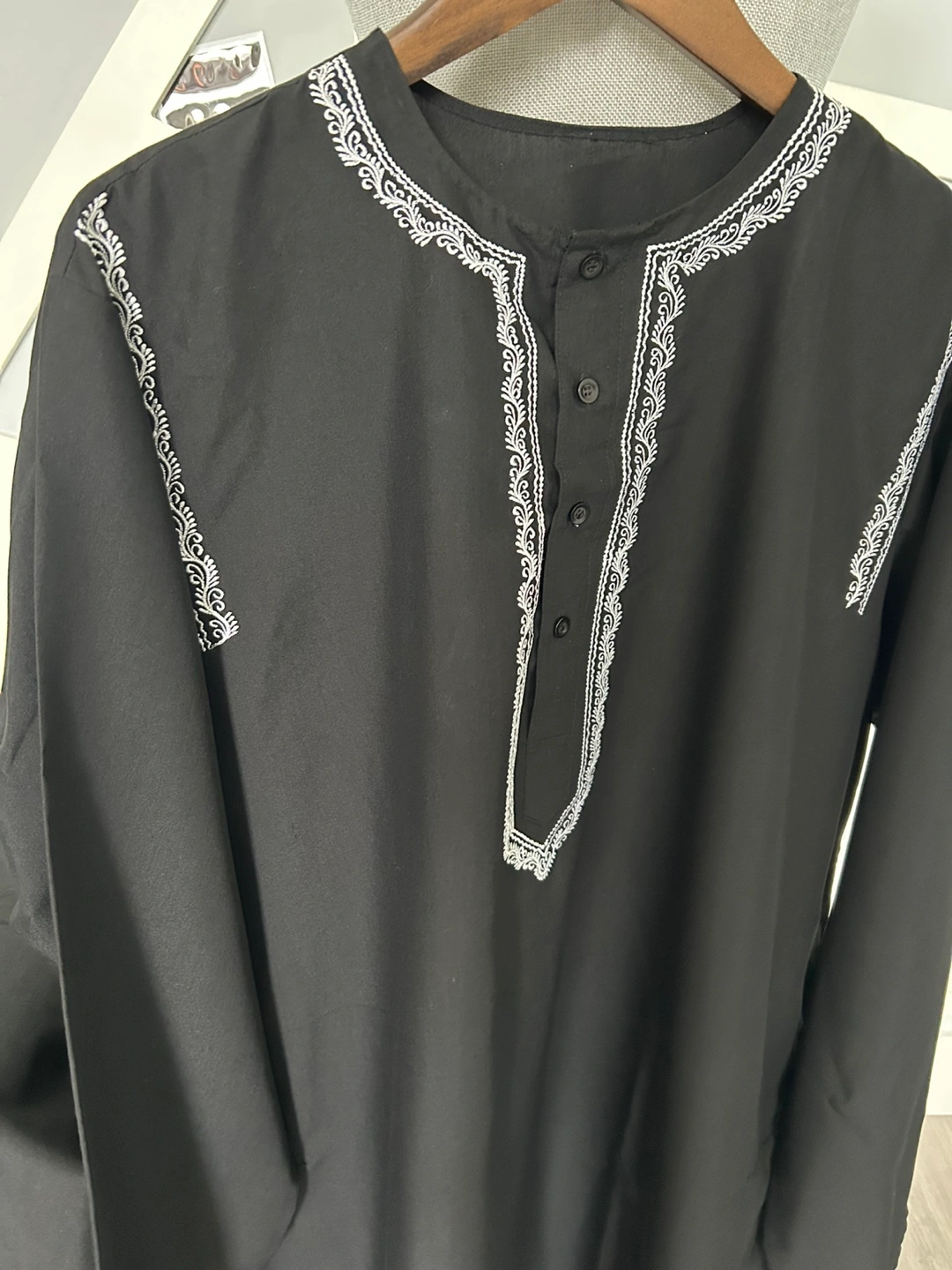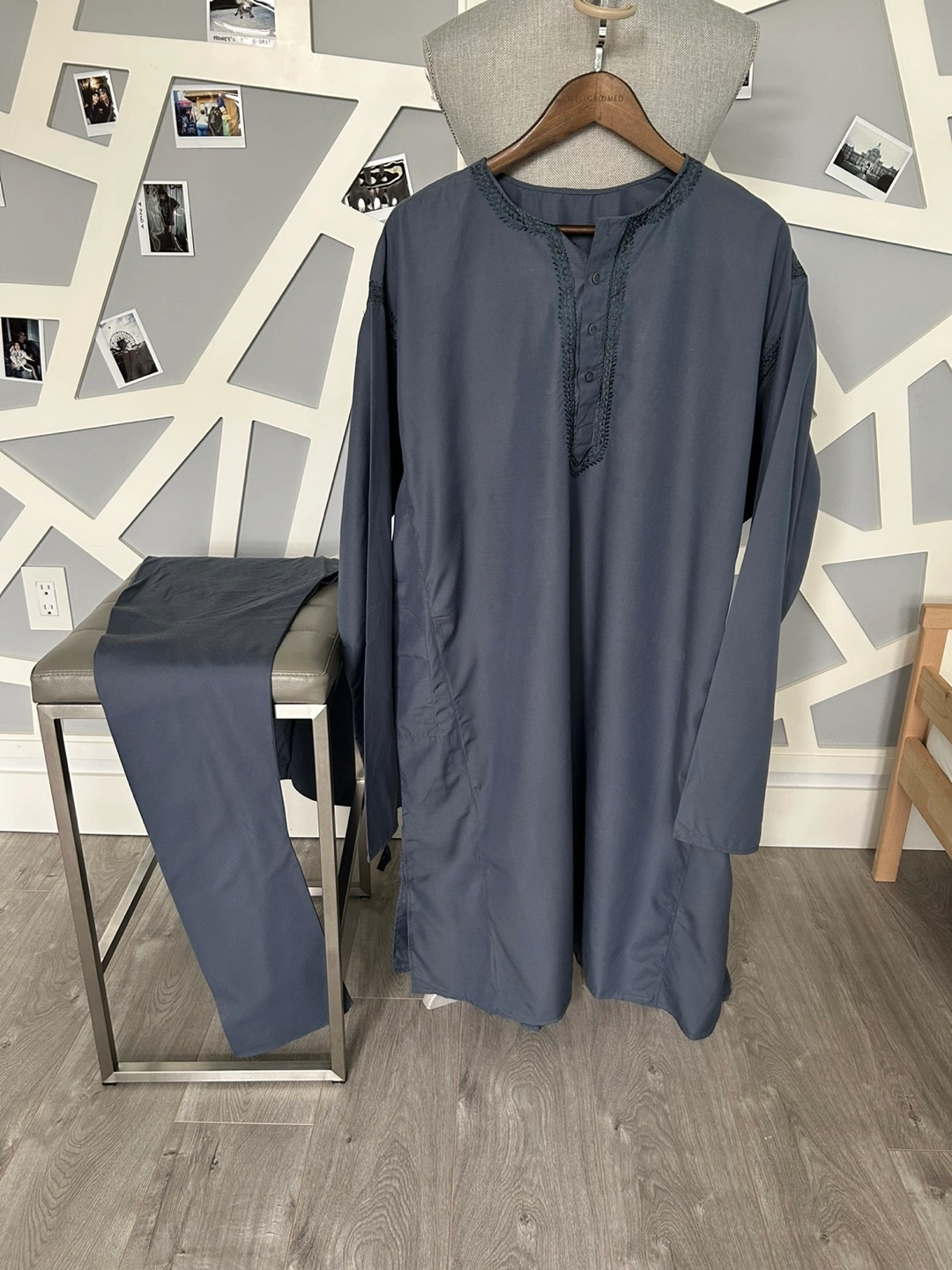Selling men's kurta pajama sets! One is black with white embroidery, the other is beige. Another in blue. Perfect for a special occasion or everyday wear. $30 each set.