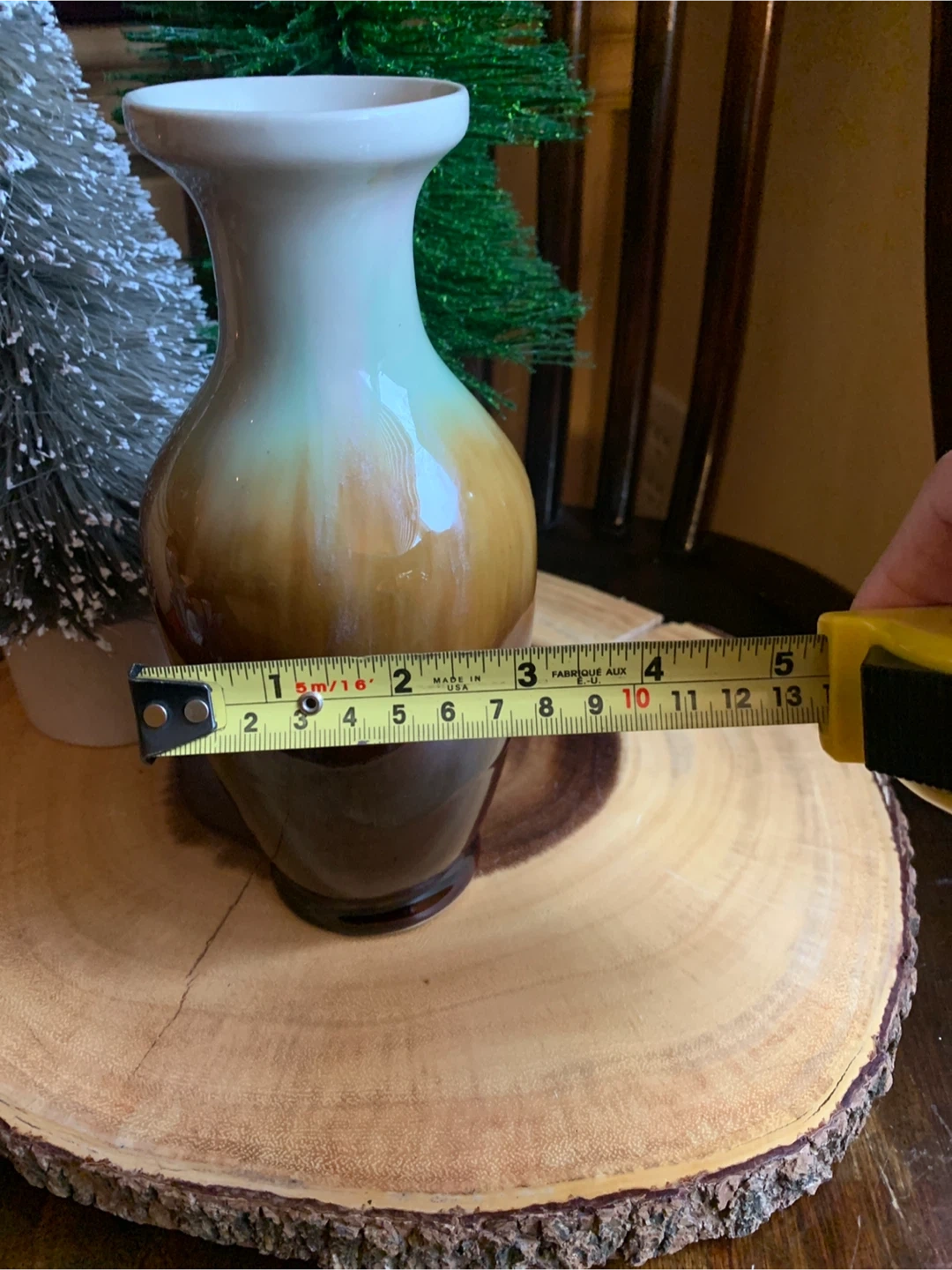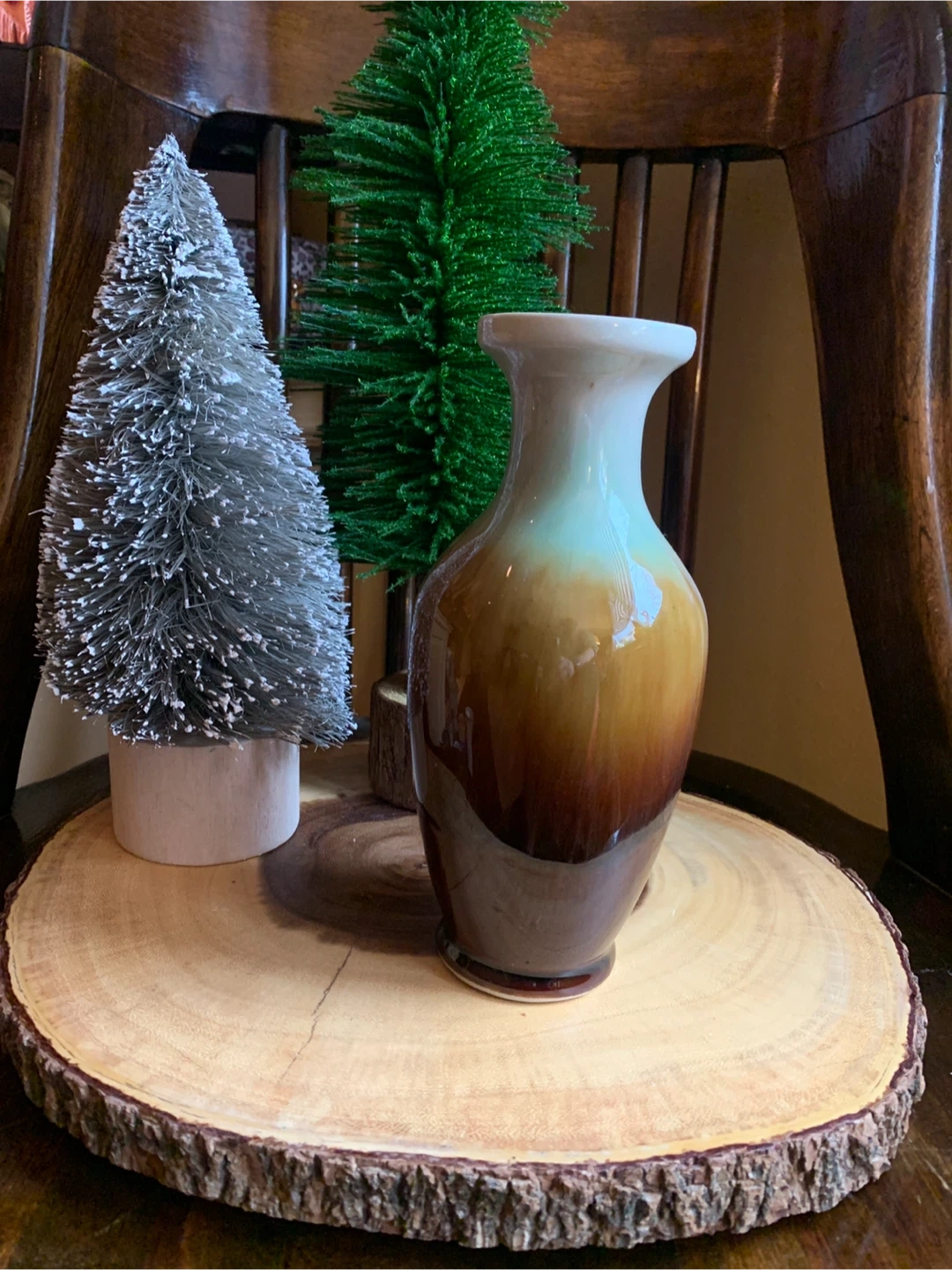 A classic drip glazed pottery vase with a beautiful ombre finish transitioning from cream to light green to deep brown. It's perfect for displaying fresh flowers or as a standalone decorative piece sitting on a bookshelf or table. This vase adds a touch of rustic charm to any room with its lovely shape and colouring!