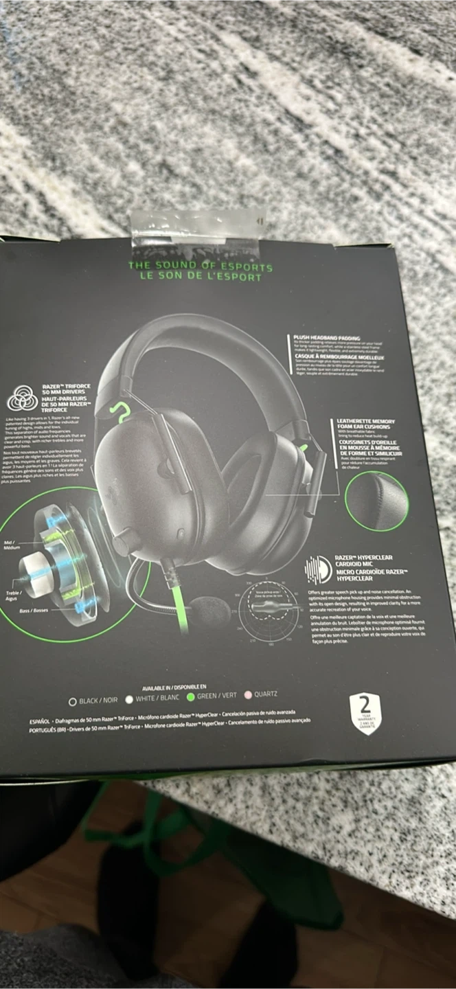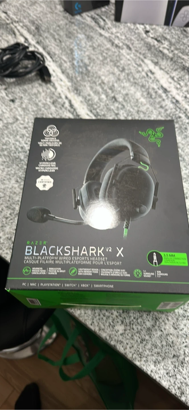 This is the Razer Blackshark V2 X headset. It features 50 mm TriForce drivers and a HyperClear cardioid mic. The headset is lightweight with memory foam earcups.