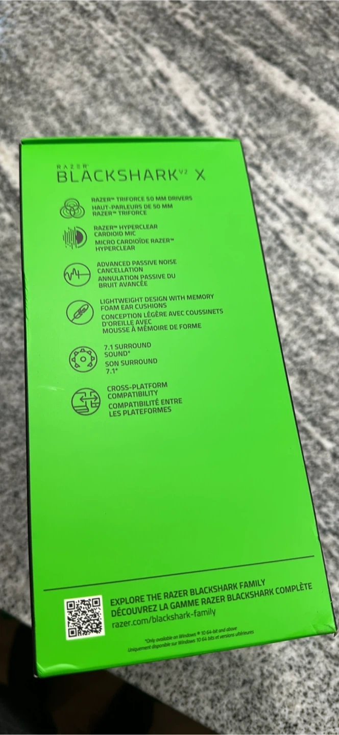 This is the Razer Blackshark V2 X headset. It features 50 mm TriForce drivers and a HyperClear cardioid mic. The headset is lightweight with memory foam earcups.