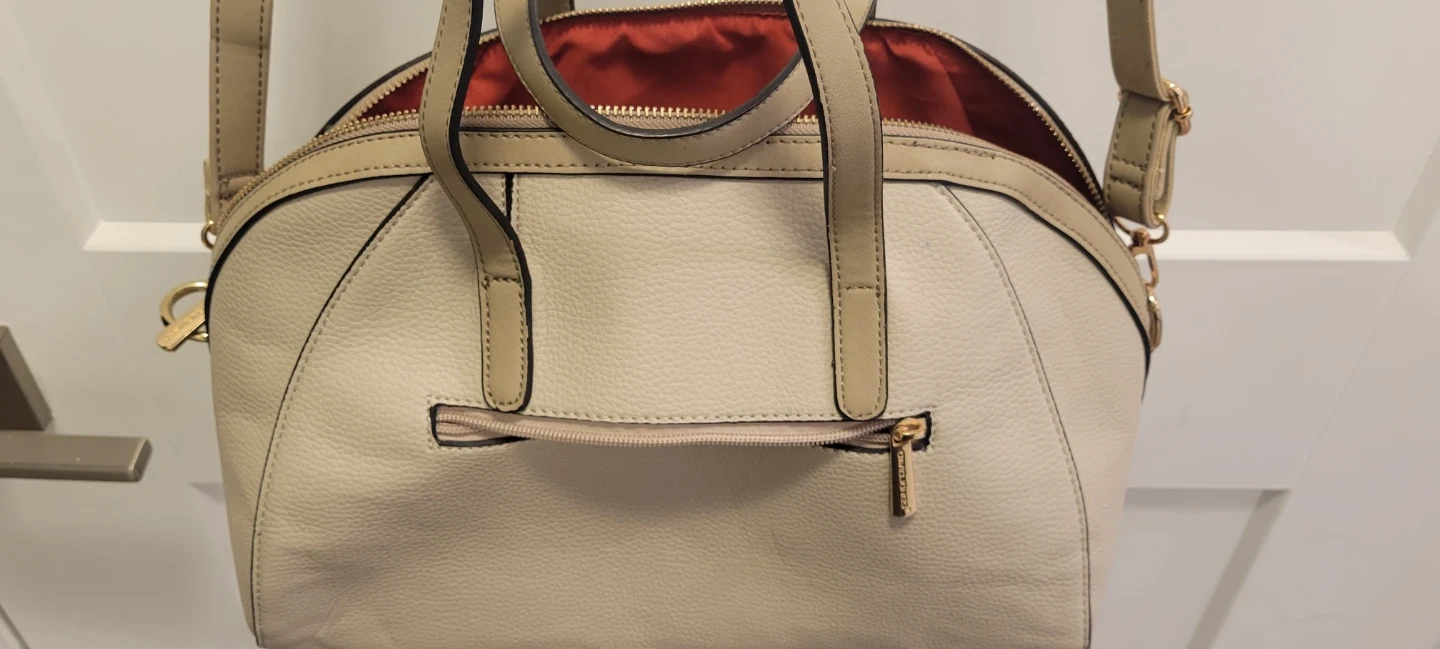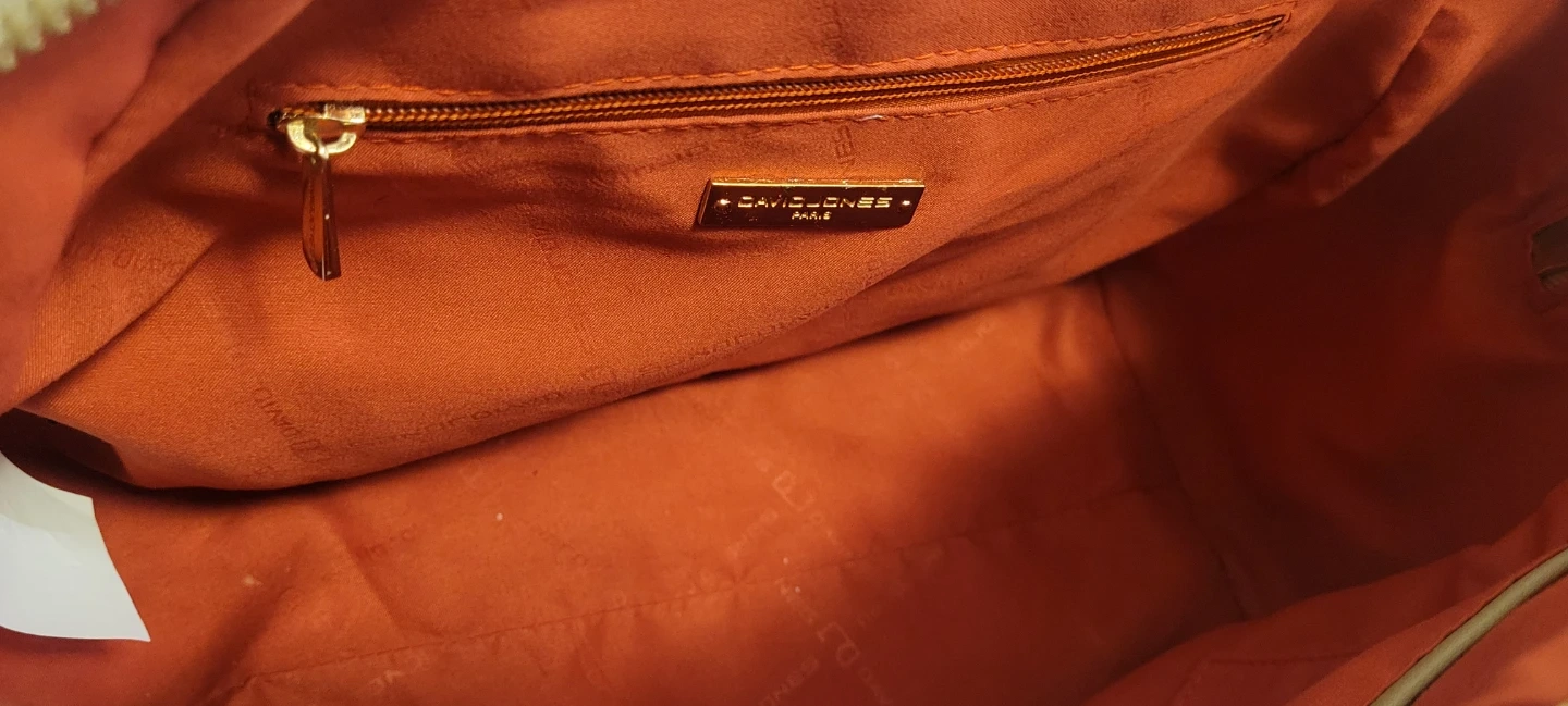 This is a beige textured faux leather handbag from David Jones Paris. It has top handles and a detachable shoulder strap. The interior is lined with a vibrant orange fabric and features a zippered pocket.