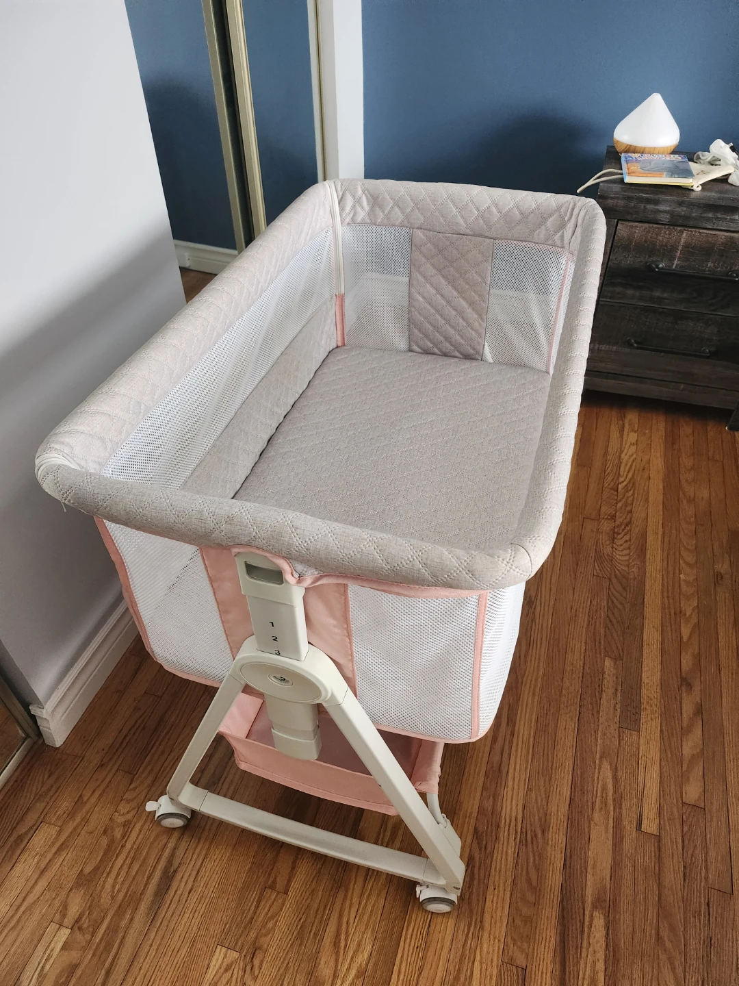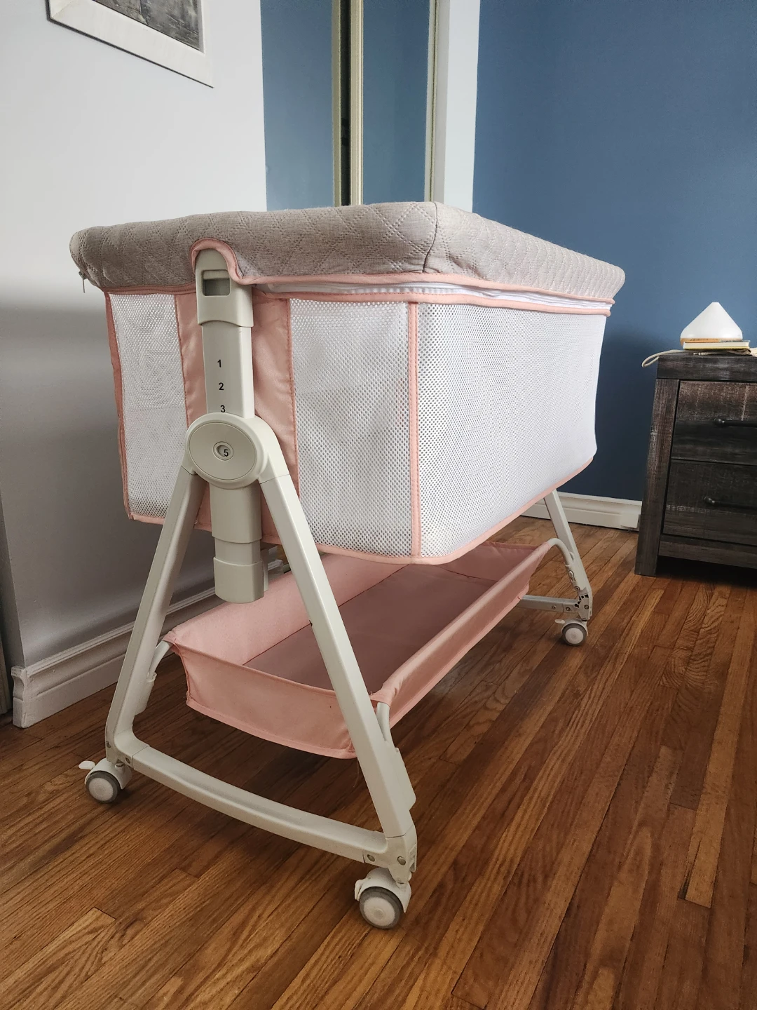 This infant bassinet is designed for bedside sleeping, making it easy to keep your little one close. It features a mesh siding for ventilation and a storage basket underneath. The bassinet is on wheels for easy mobility.