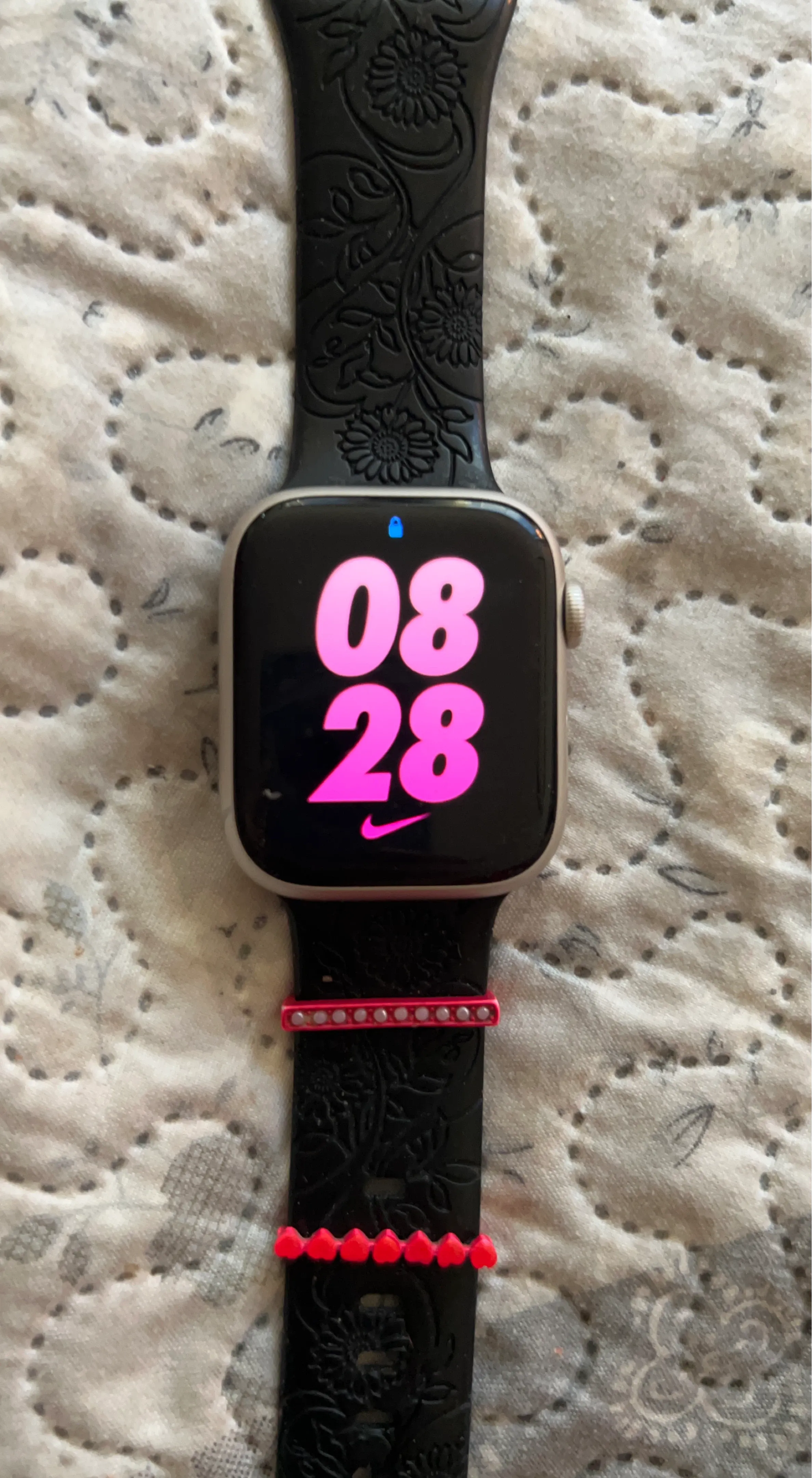 Nike branded Apple Watch Series 4. This watch features a digital crown and a black band with a floral pattern. It's a great smartwatch for fitness tracking.
