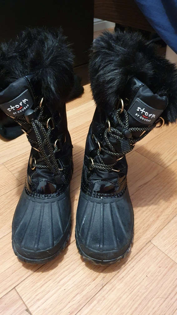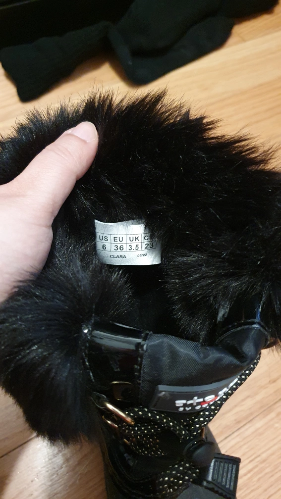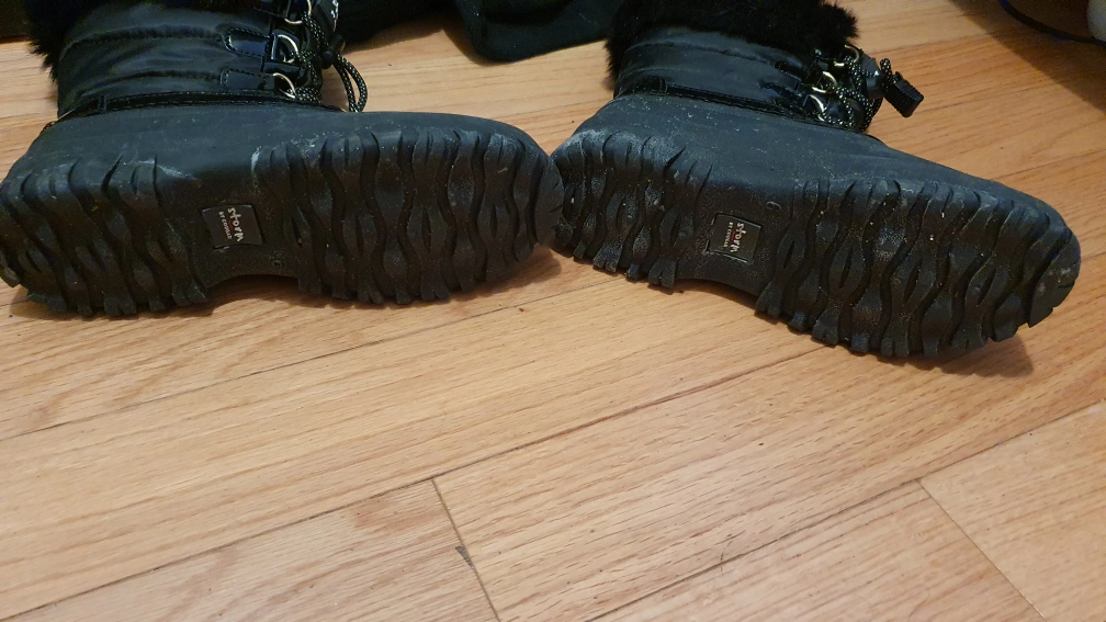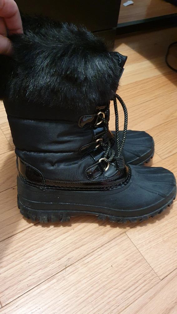 Size 6 but fits a slightly larger foot. I have worn them once in snow and that's all. Great grip. They have a rubber front and are warm. Sanitized. I hope they find a pair of feet soon because they're really stylish and functional at the same time! Cash and pick up only near York Mills station