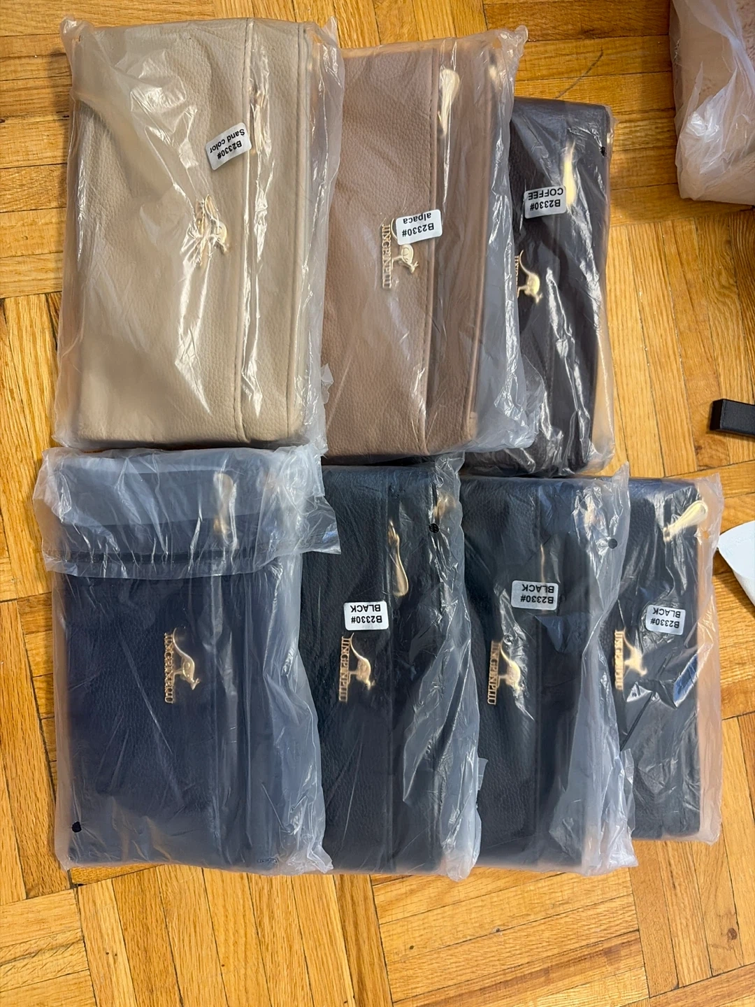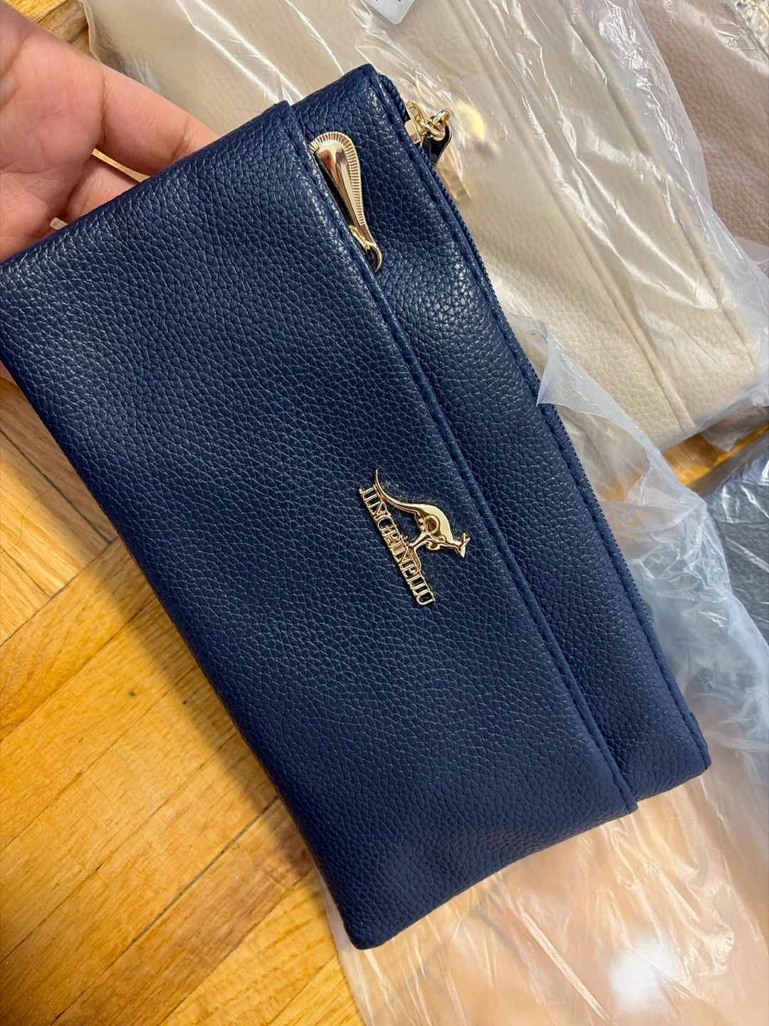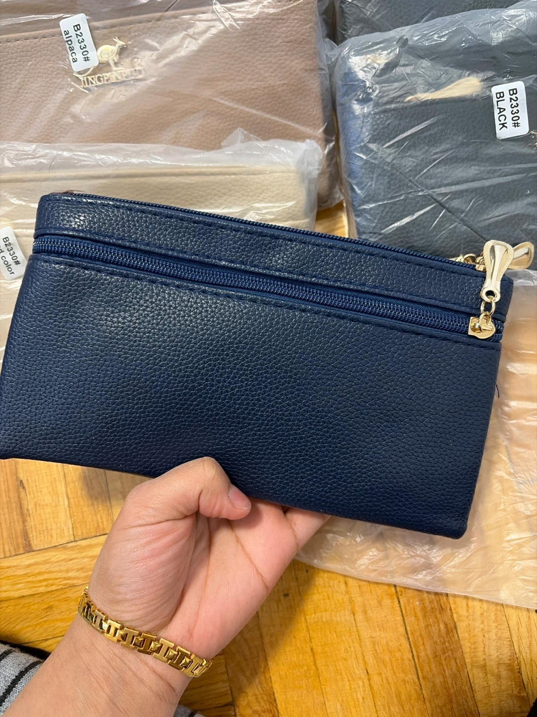 This navy blue faux leather clutch features a pebbled texture and gold-toned hardware. It has multiple zippered compartments to keep your essentials organized. The material is durable and the design is stylish. It's suitable for carrying cards, cash, and other small items.
