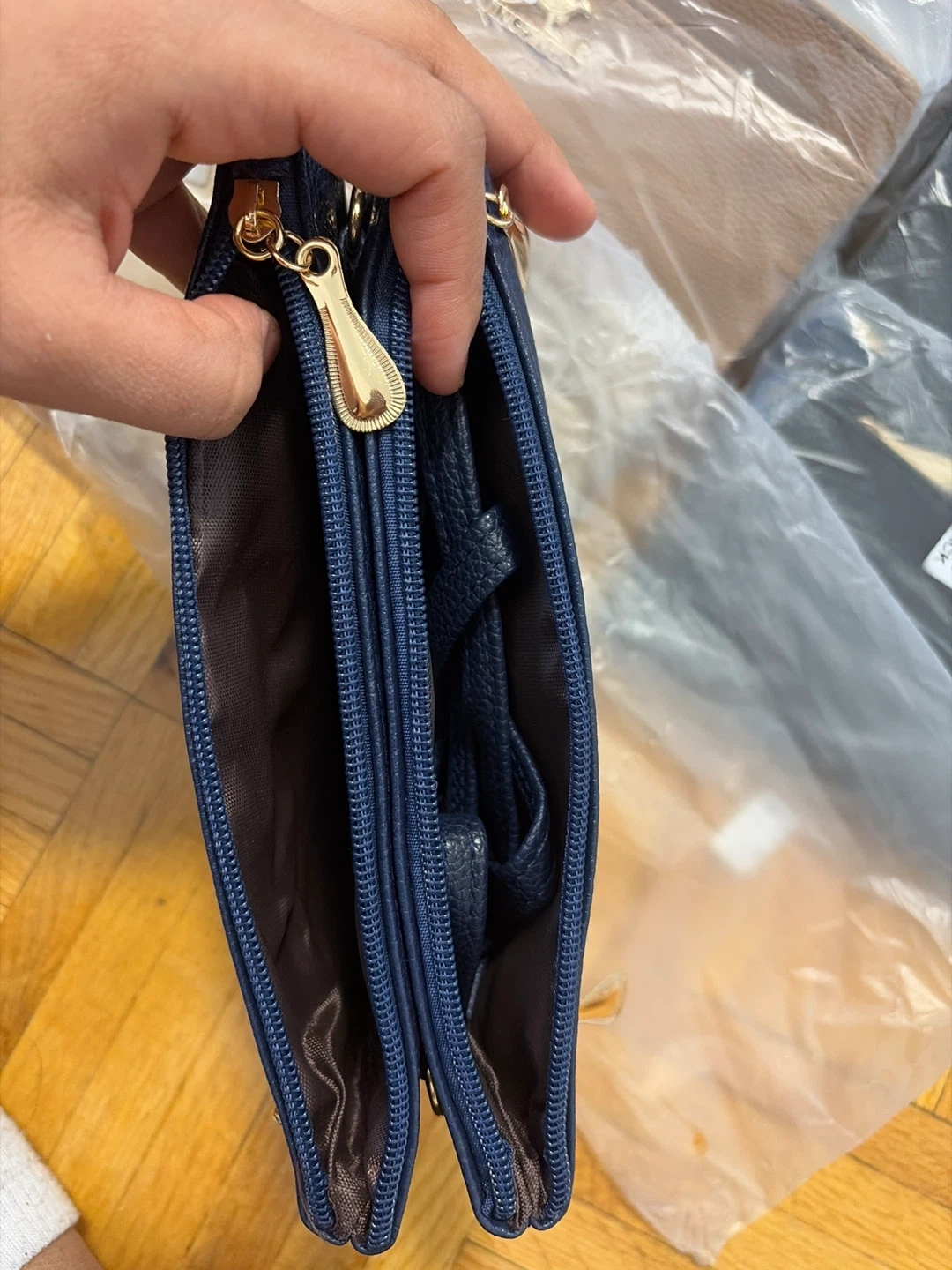 This navy blue faux leather clutch features a pebbled texture and gold-toned hardware. It has multiple zippered compartments to keep your essentials organized. The material is durable and the design is stylish. It's suitable for carrying cards, cash, and other small items.