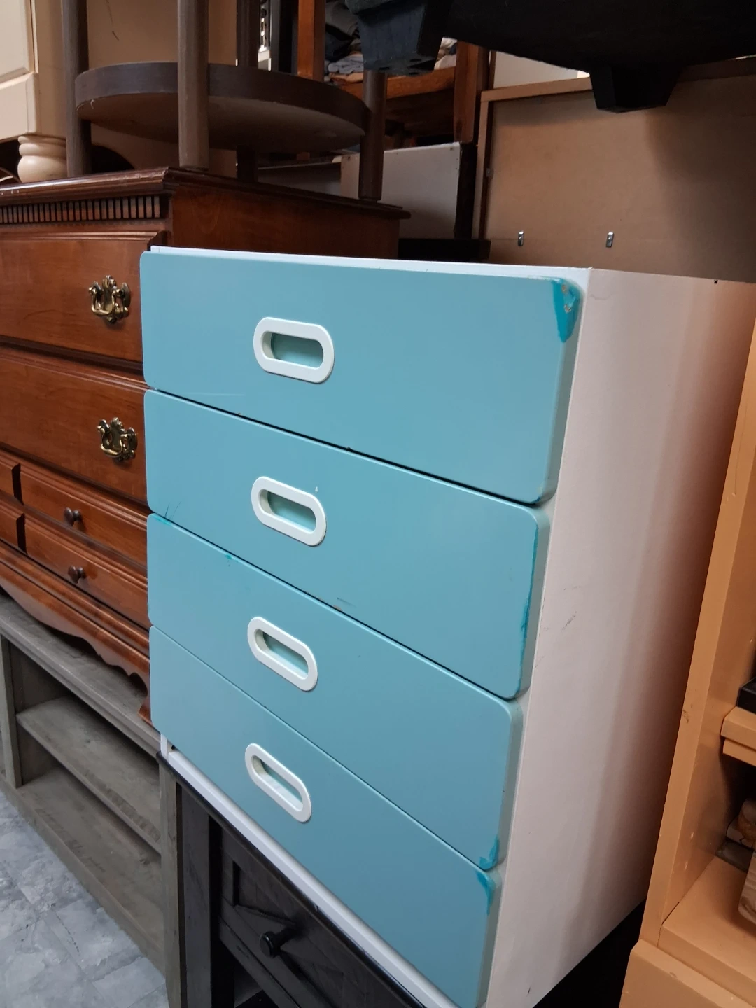 Four-drawer chest with a light blue front and white sides. Features white oval handles. Some minor scuffs on the edges. Great for organizing clothes or small items! Tienda de segunda mano uvicacion 5521 w de la Belmont aven open 11 am cierrre de la tienda 7 pm llamar si tieneuna pregunta sobre un producto si estan disponibles +17733268814 llamar por WhatsApp
