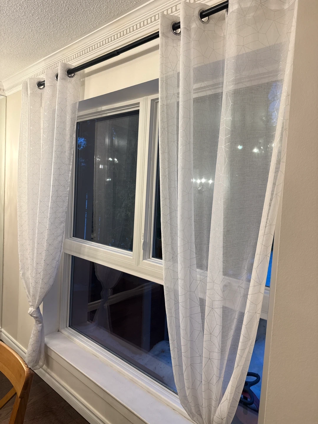 Sheer white curtains with a subtle geometric pattern. They're made from a lightweight fabric and have grommet tops for easy hanging. Add a touch of modern style to any room! With bar. 2 sets available
