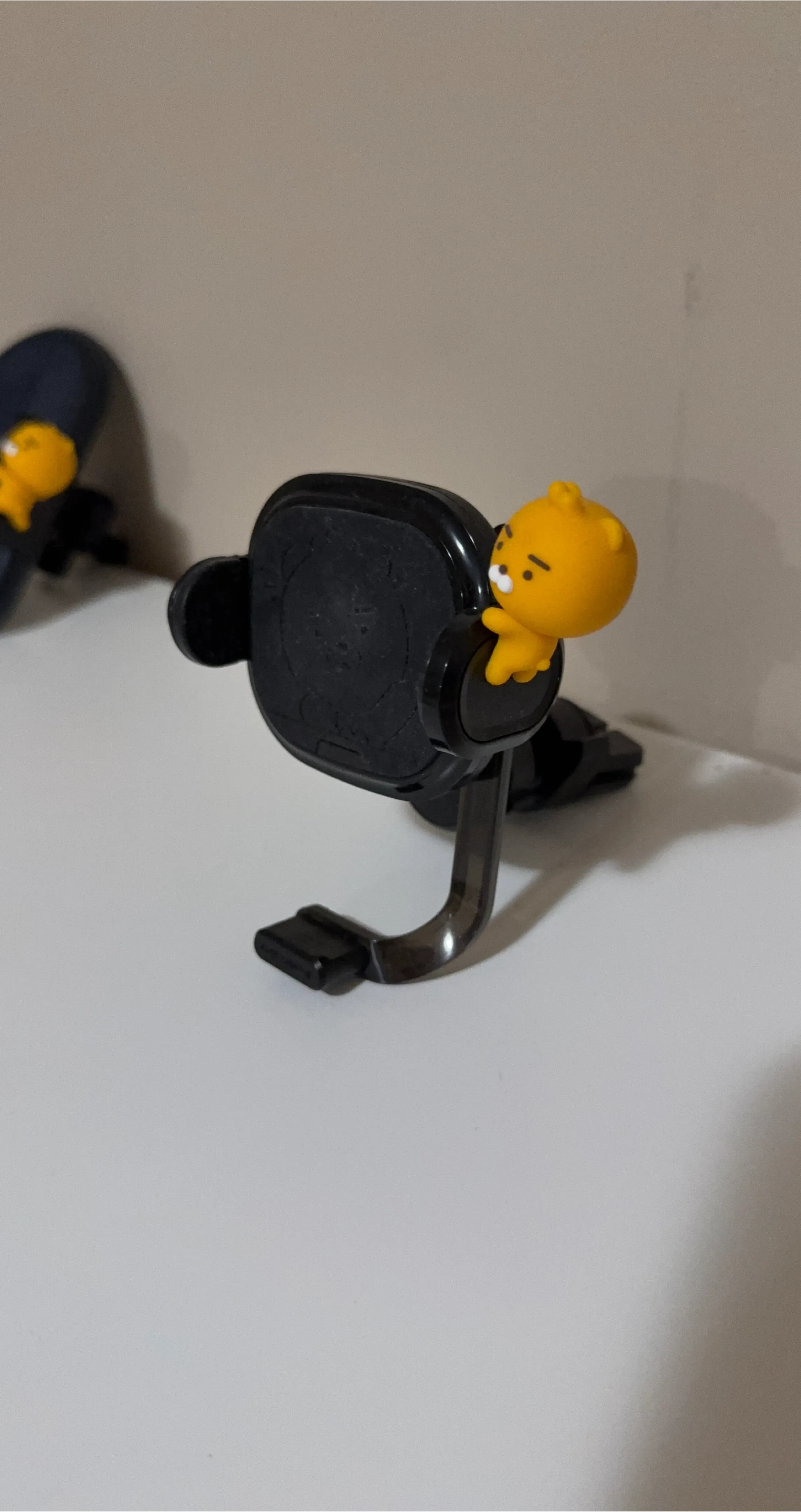 This is a car phone charger featuring a cute Ryan character from Kakao Friends. It's designed to securely hold your phone while you drive. The holder has a flexible arm and a base that attaches to your car's dashboard or vent. Comes with original charging cable.