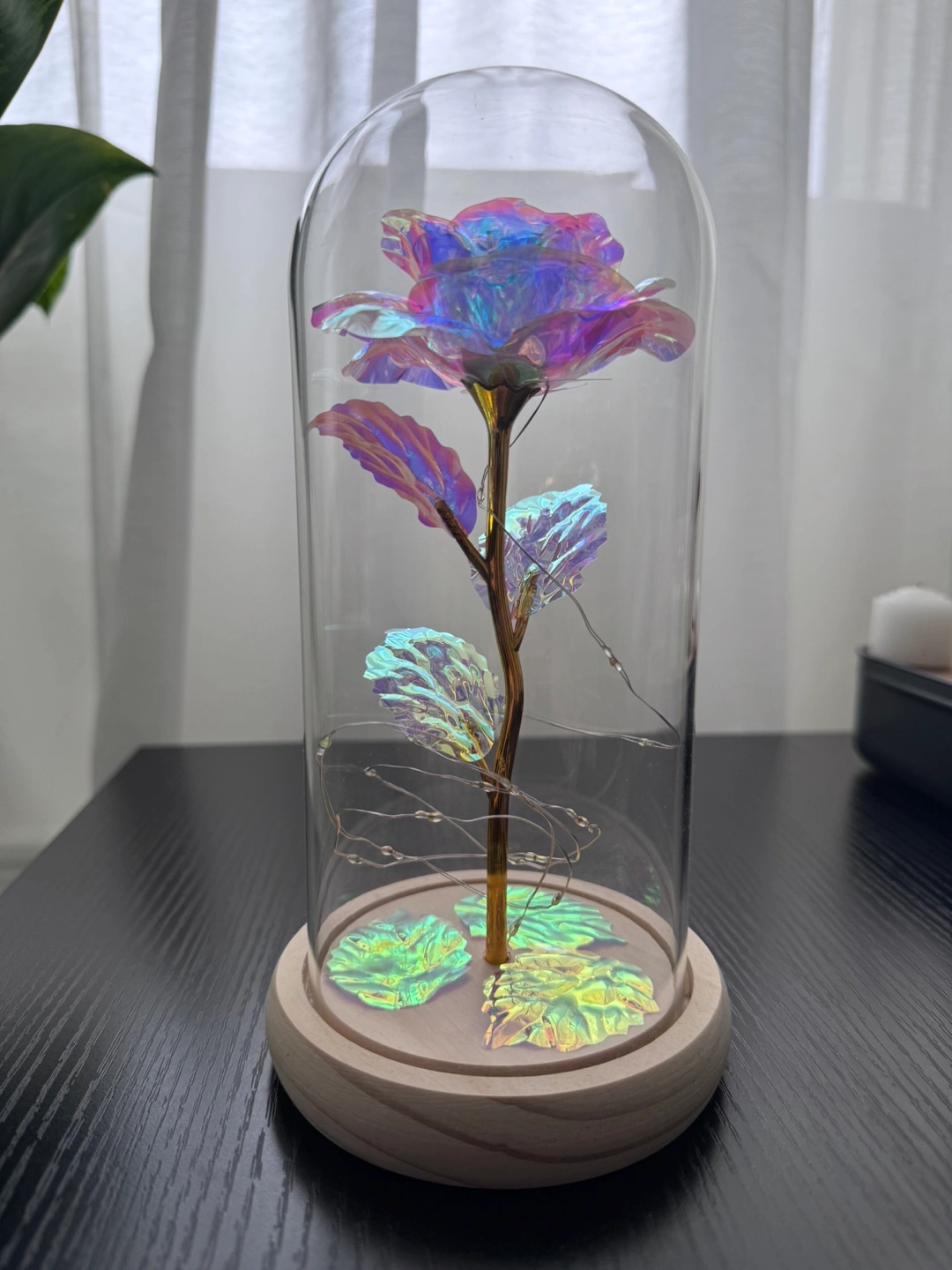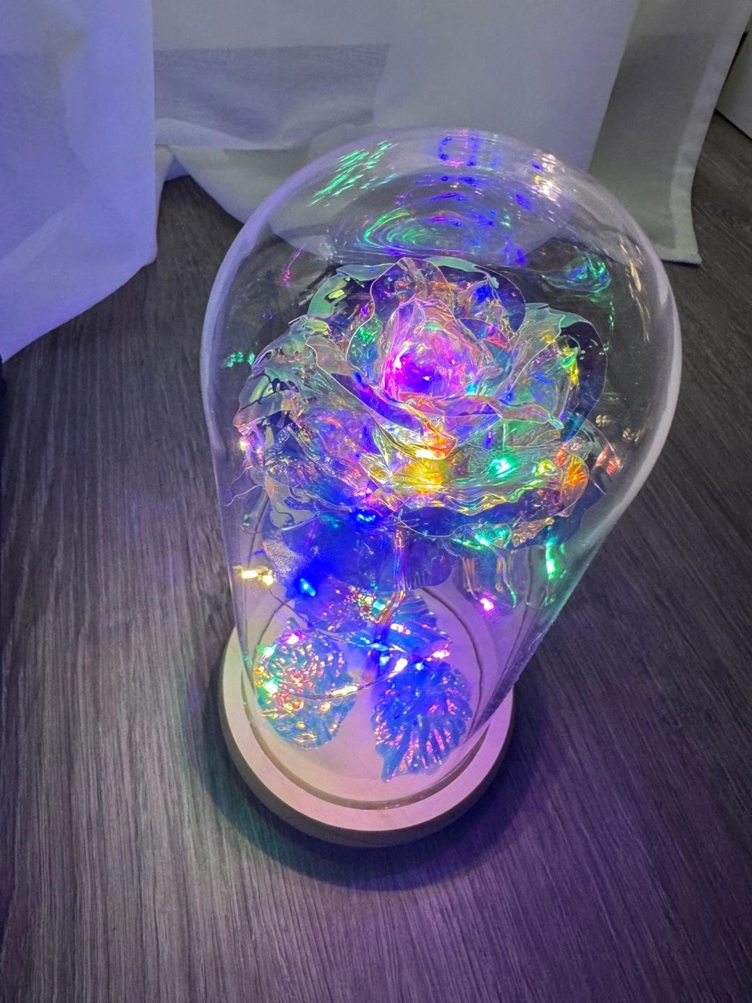 Beautiful iridescent rose with gold stem, encased in a clear glass dome. Features integrated LED lights. Wooden base included. Perfect for decoration or gifting.