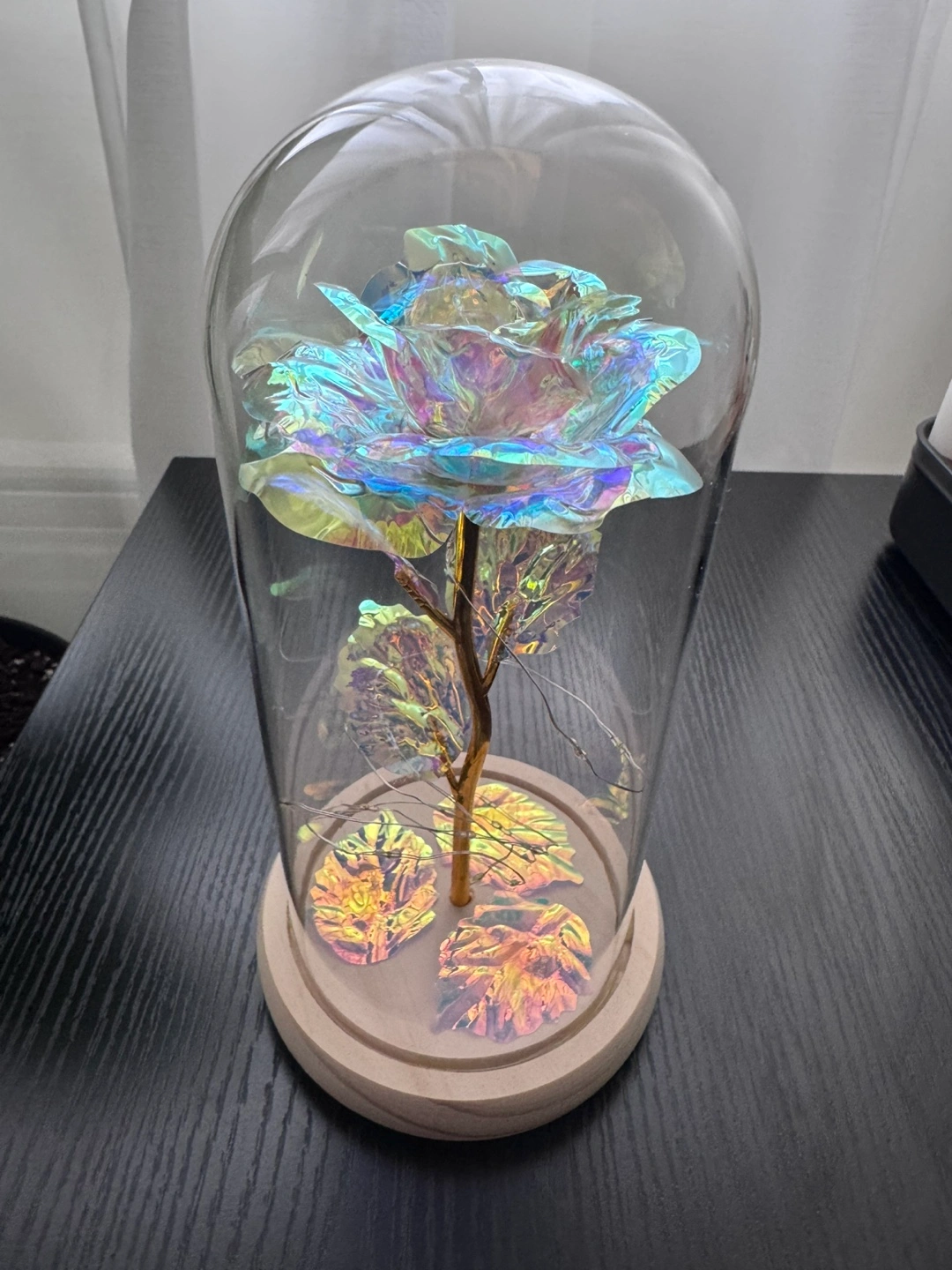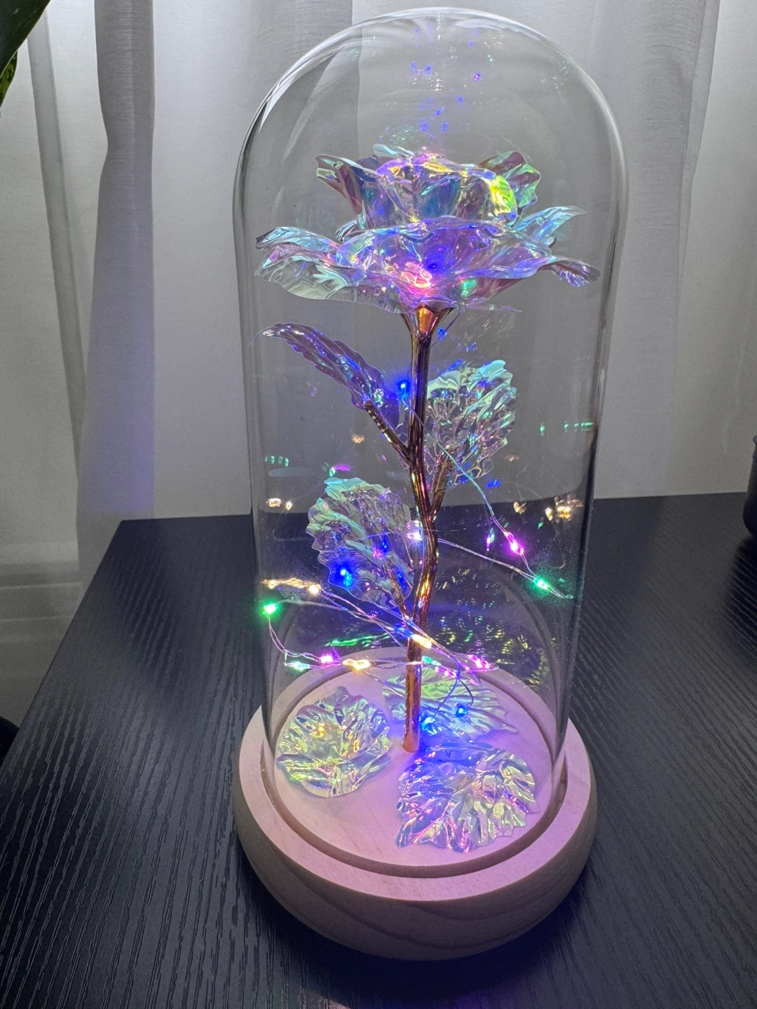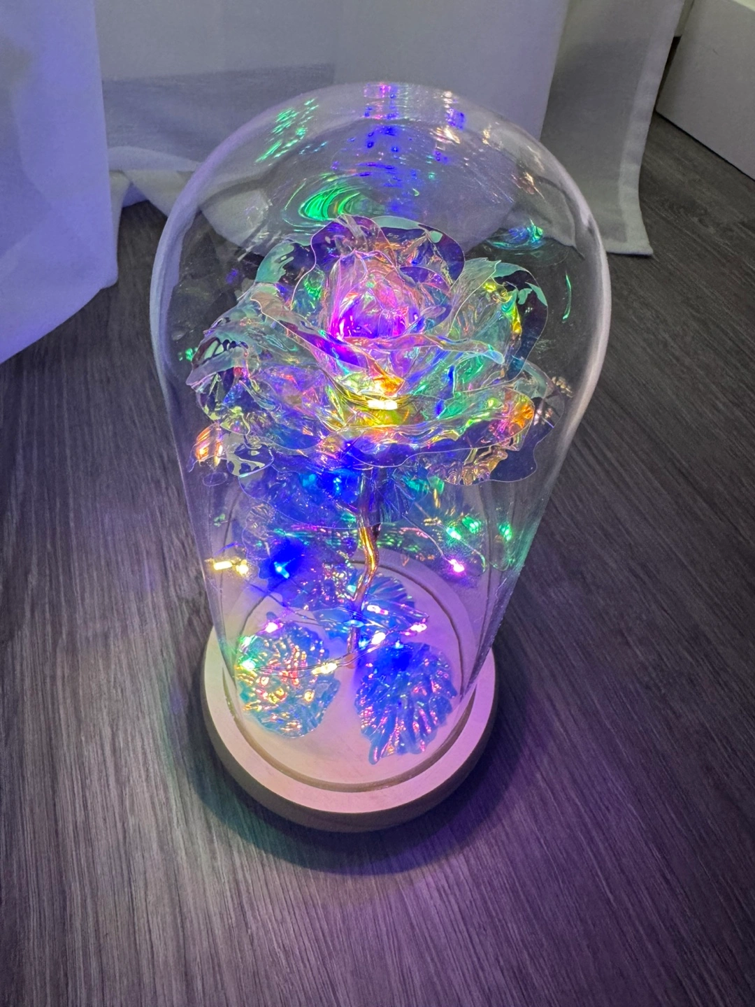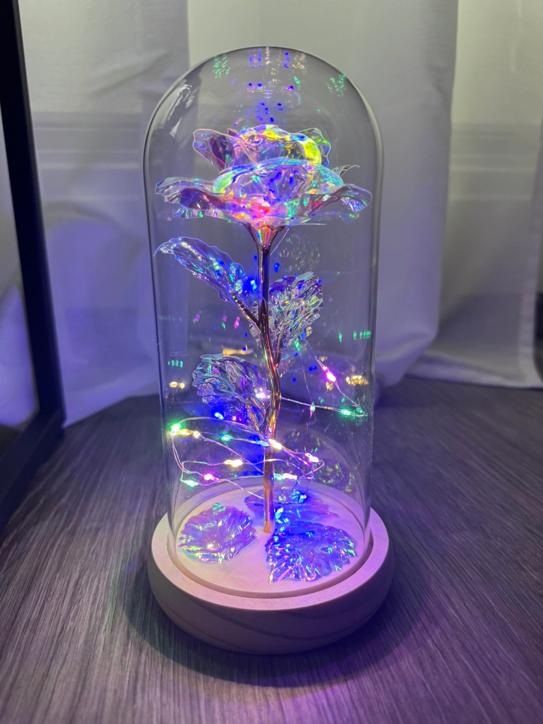 Beautiful iridescent rose with gold stem, encased in a clear glass dome. Features integrated LED lights. Wooden base included. Perfect for decoration or gifting.