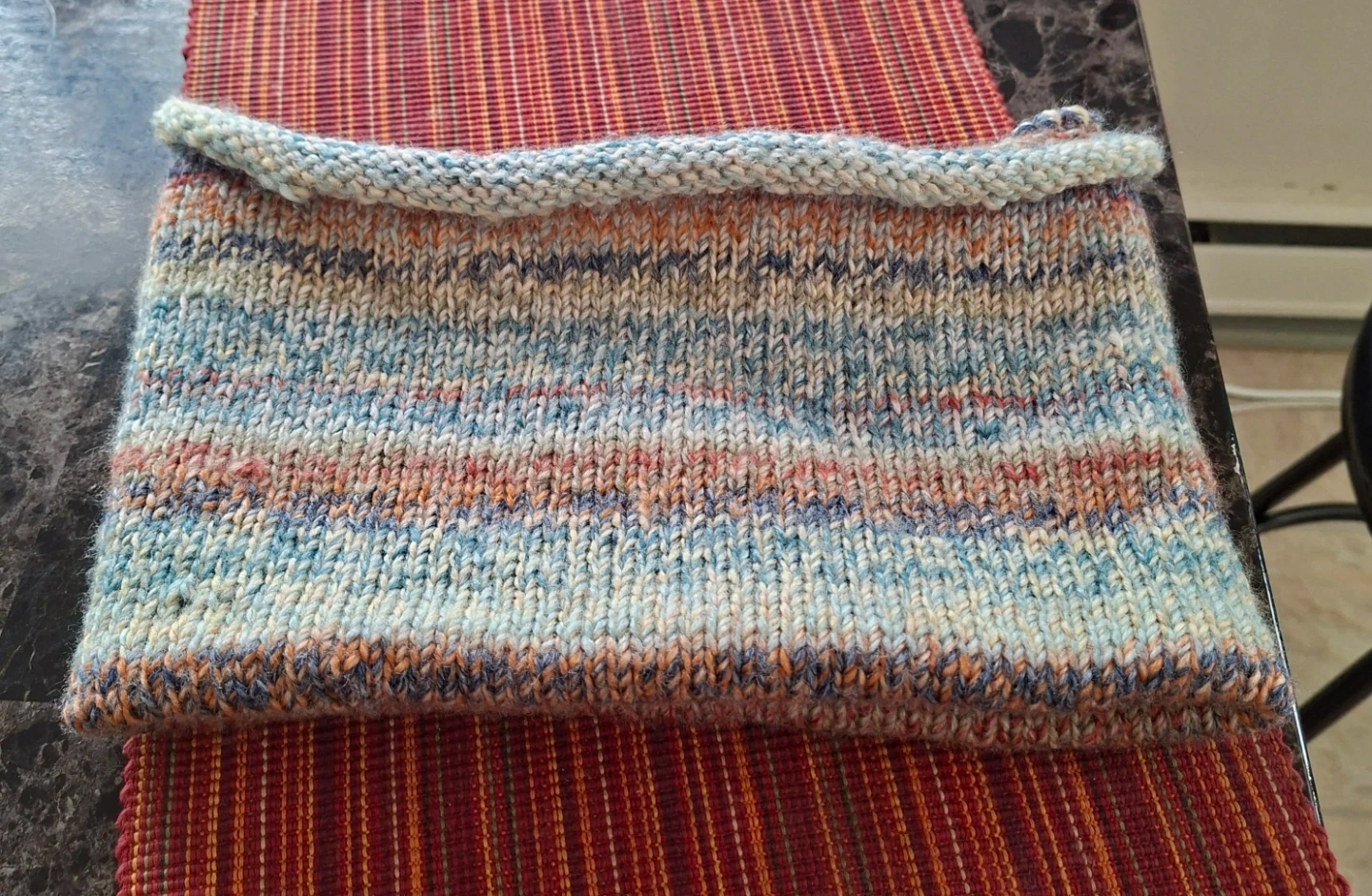 Cozy, hand-knitted cowl scarf with a multicoloured yarn, keeping the neck/face warm. It's made of a soft wool blend. This cowl is perfect for adding a pop of colour to your outfit on a chilly day!