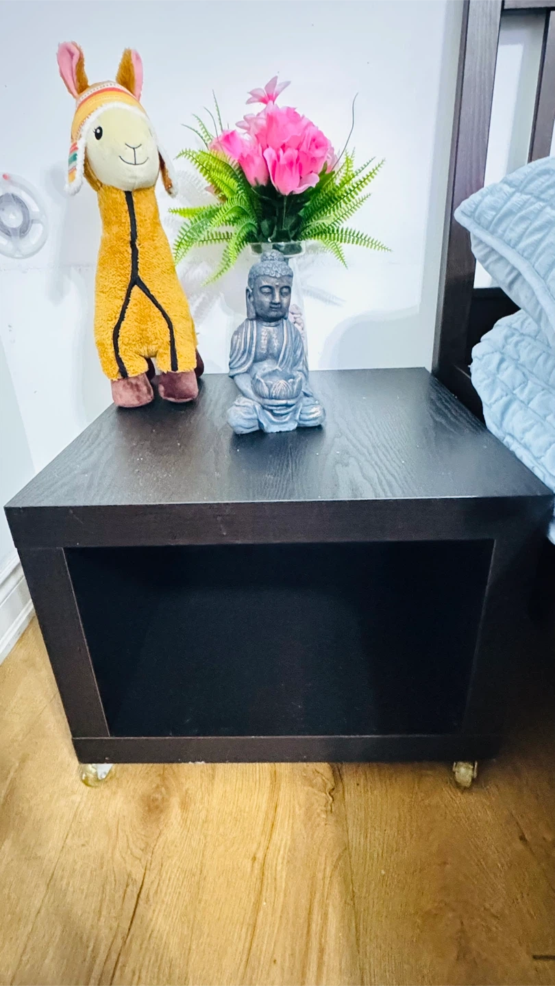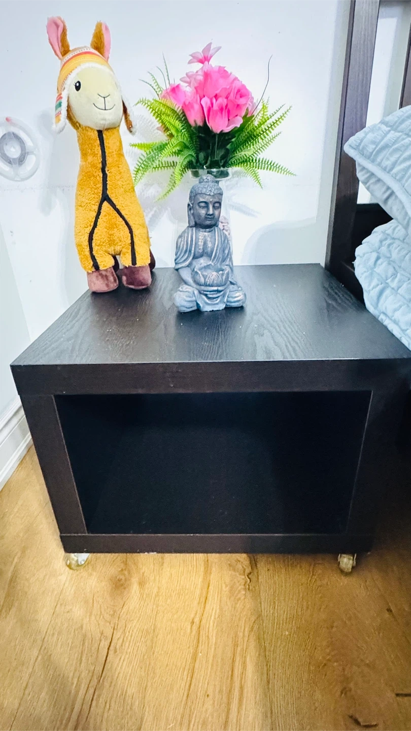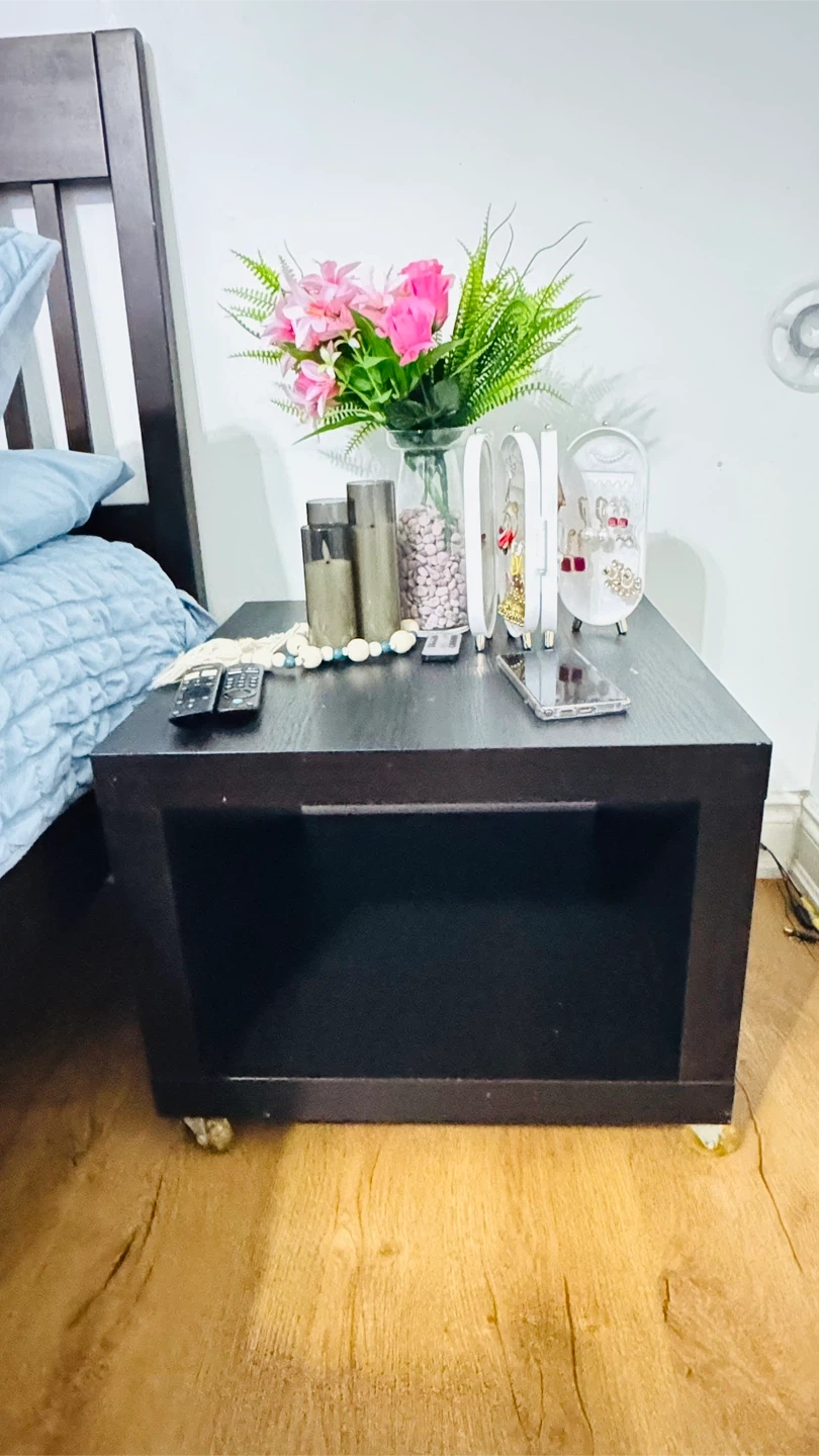 This dark brown cube side table features a handy open shelf for storage. It's on wheels, making it easy to move. A simple, functional piece for your bedroom or living space!