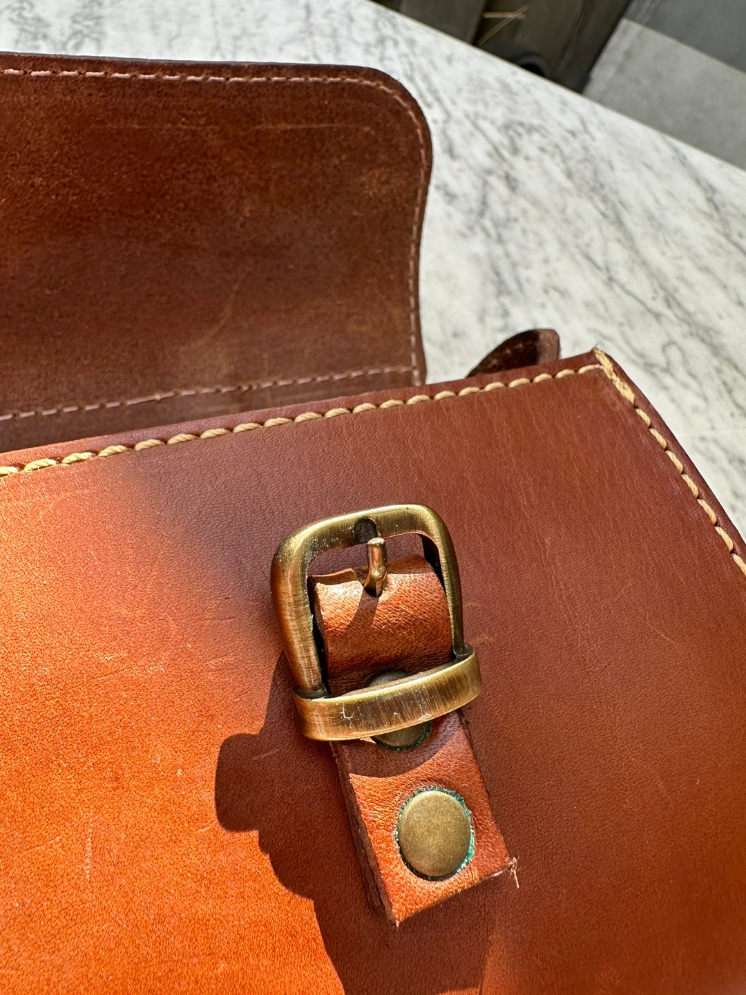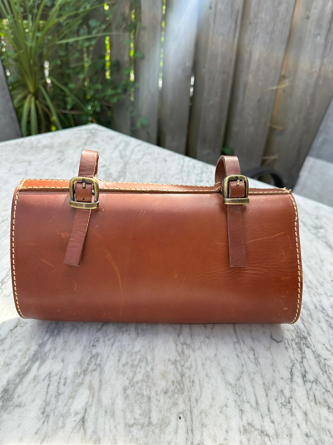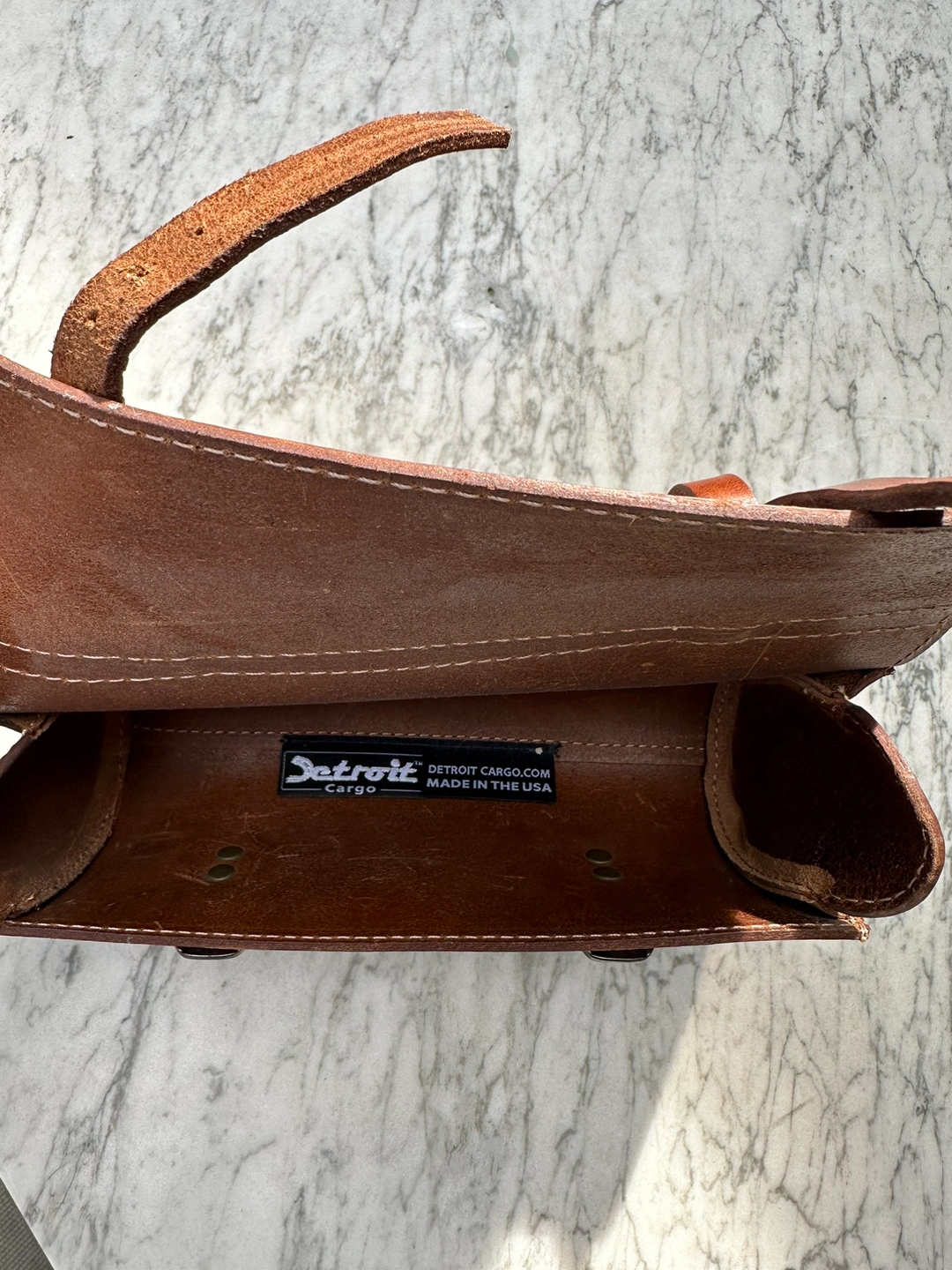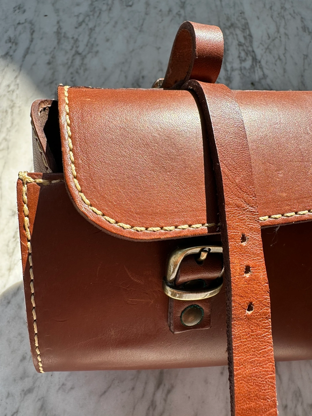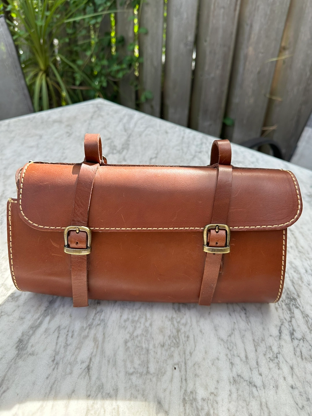 High-quality brown leather bicycle saddle bag, for carrying tools or a roadie or two! Has buckles and a couple of straps to hang from the saddle or front wheel. Barely used, beautiful stitching.