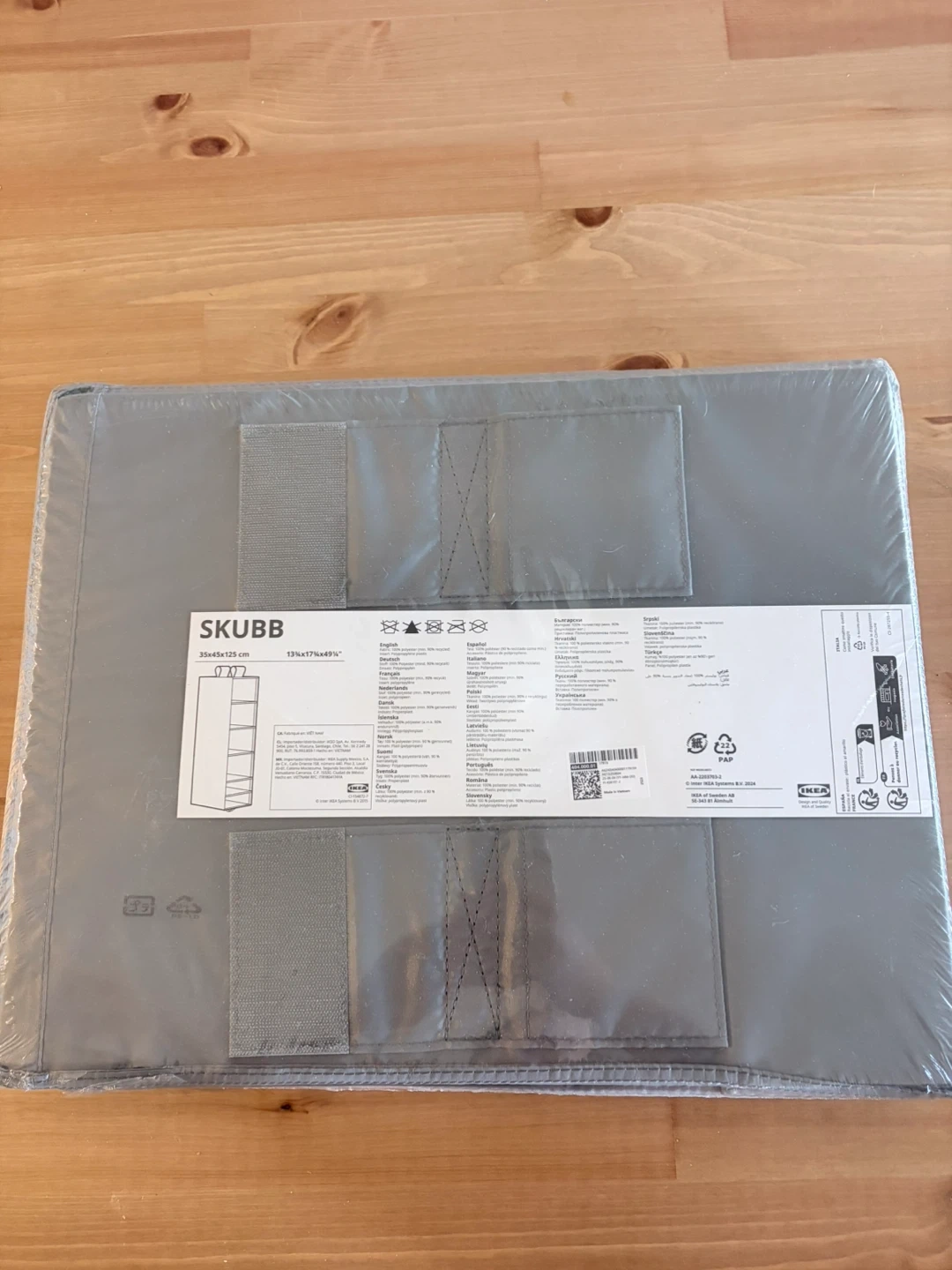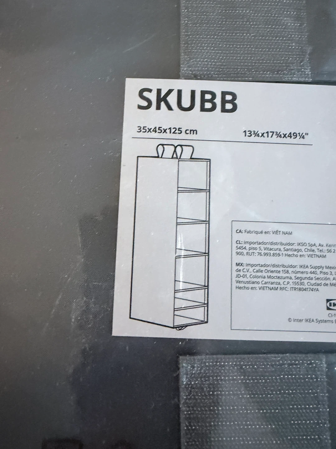 This is a new IKEA SKUBB storage organizer with multiple shelves. Dimensions are 35x45x125 cm. It's made of fabric and includes fabric loops for hanging. Brand new!
