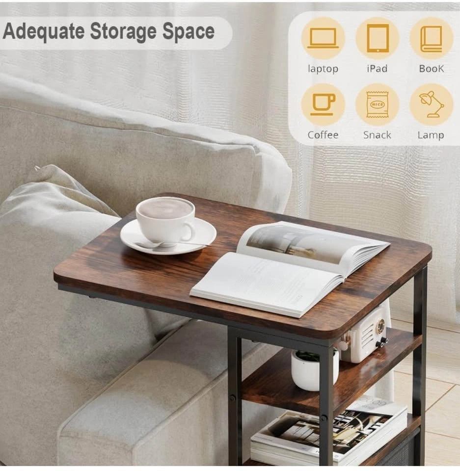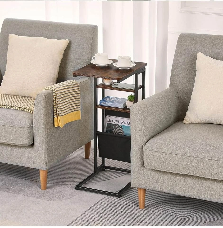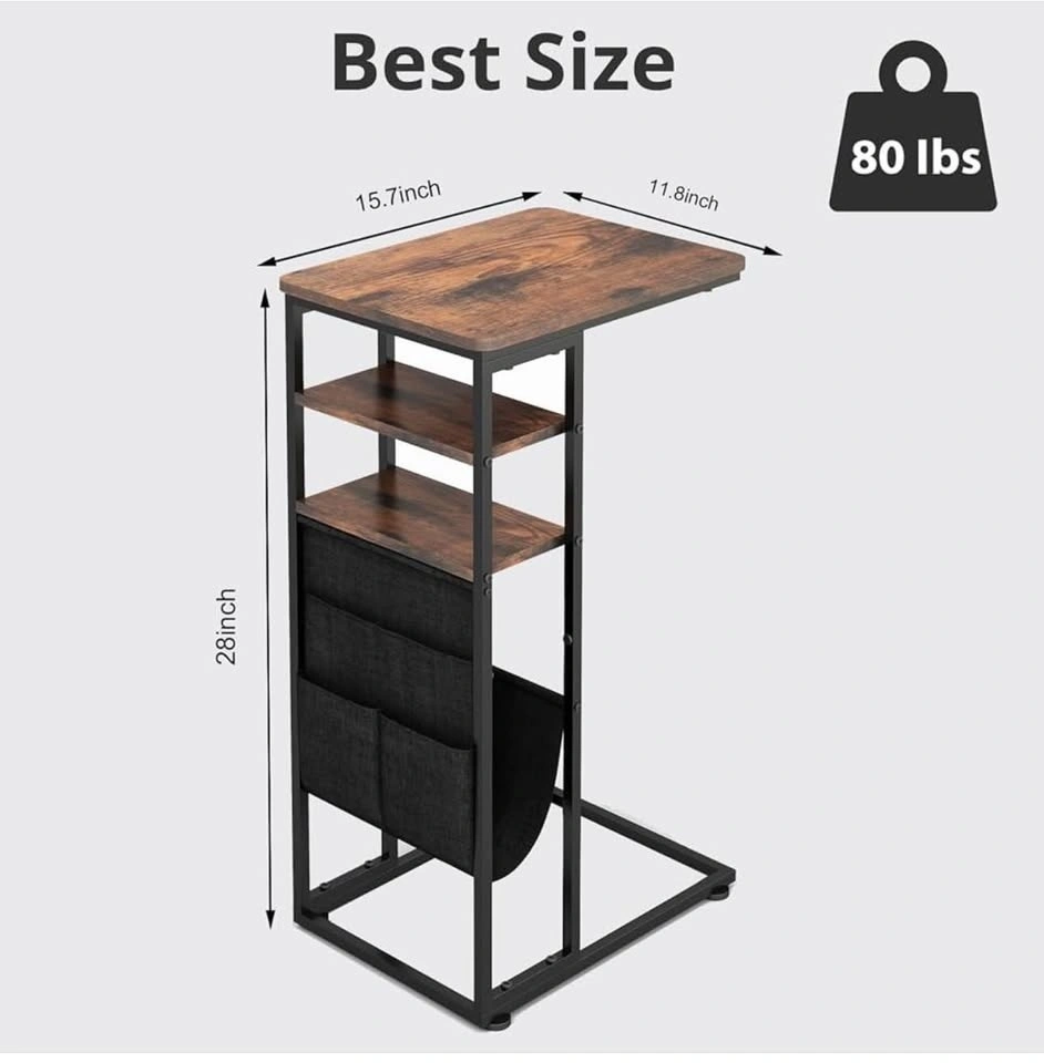 This C-shaped end table slides easily under your sofa, bed, or chair. It's designed for small spaces, measuring 15.7"D x 11.8"W x 28"H, which is a comfortable height for most sofa armrests. It features a built-in charging station with two USB ports (5V/2A) and one AC outlet (120V/12A) with a safety system. The 4.9-foot power cord offers flexibility. The table has 3 storage shelves and a side storage bag perfect for holding tablets, newspapers, magazines, remotes, phones, and chargers. The frame is sturdy iron, built to last and can support up to 80 lbs. Assembly is quick and easy with clear instructions and included tools. Let me know if you're interested!