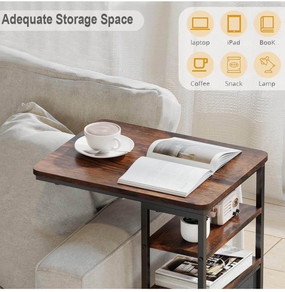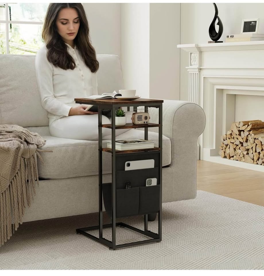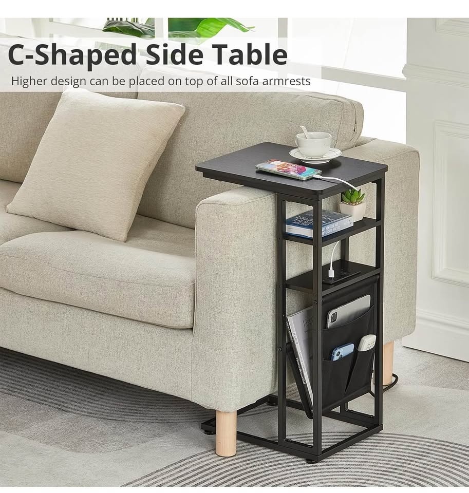 This C-shaped end table slides easily under your sofa, bed, or chair. It's designed for small spaces, measuring 15.7"D x 11.8"W x 28"H, which is a comfortable height for most sofa armrests. It features a built-in charging station with two USB ports (5V/2A) and one AC outlet (120V/12A) with a safety system. The 4.9-foot power cord offers flexibility. The table has 3 storage shelves and a side storage bag perfect for holding tablets, newspapers, magazines, remotes, phones, and chargers. The frame is sturdy iron, built to last and can support up to 80 lbs. Assembly is quick and easy with clear instructions and included tools. Let me know if you're interested!
