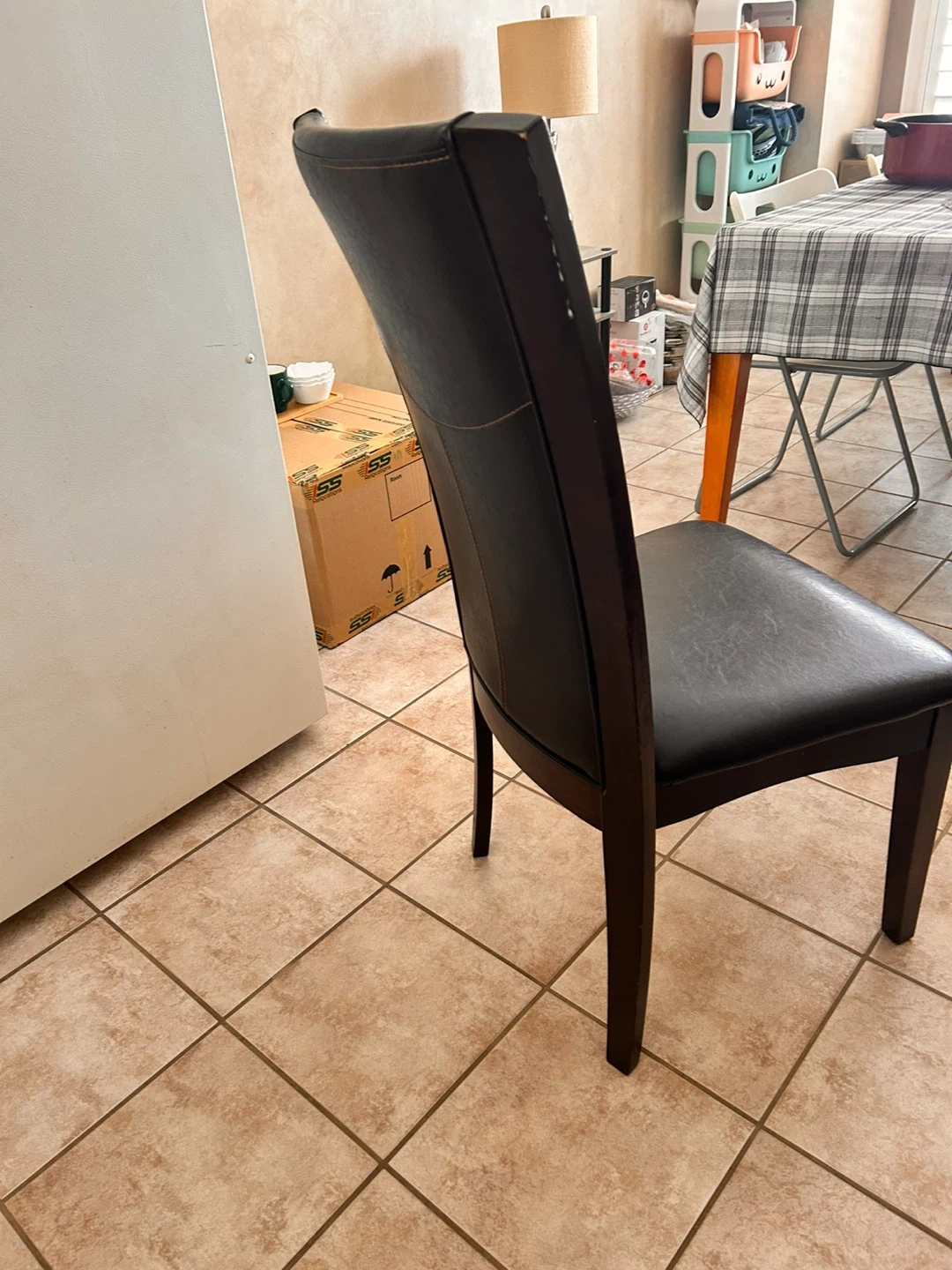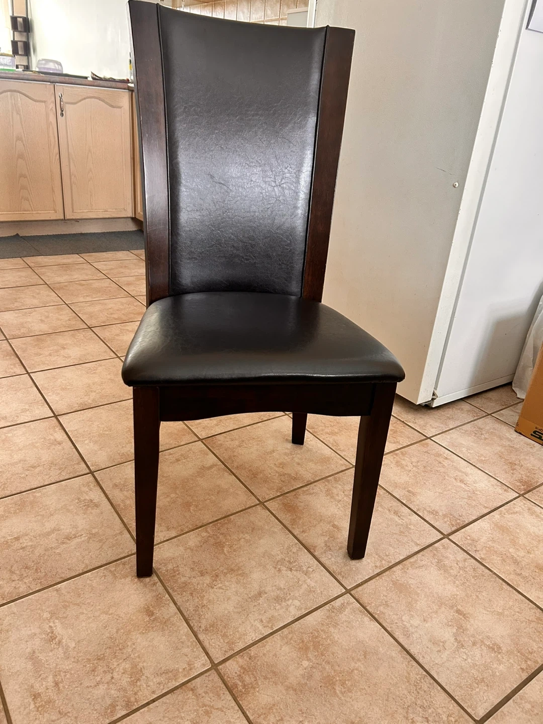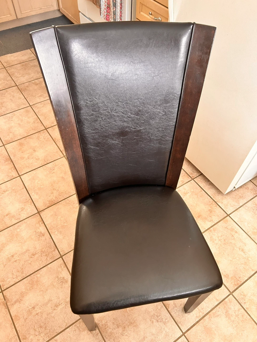 Comfortable dining chair featuring dark brown faux leather upholstery and a rich wood trim frame. It's designed with a tall, supportive backrest and padded seat for extended comfort. This chair's classic style makes it a great addition to any dining space.