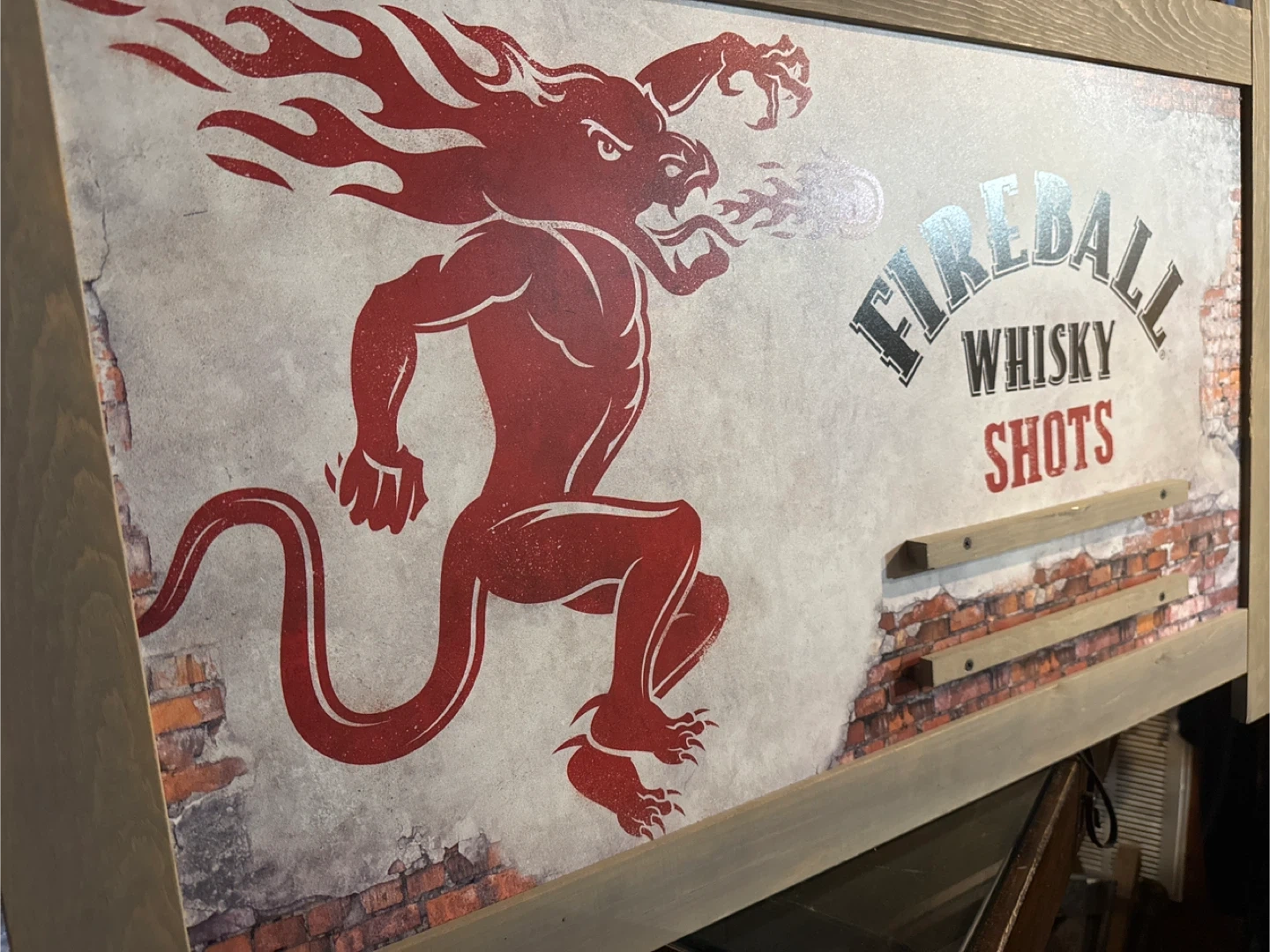 Selling a Fireball Whisky Shots bar sign. It features the Fireball logo with a dragon and the words "Whisky Shots" on a brick-like background. Perfect for a home bar or a Fireball enthusiast!